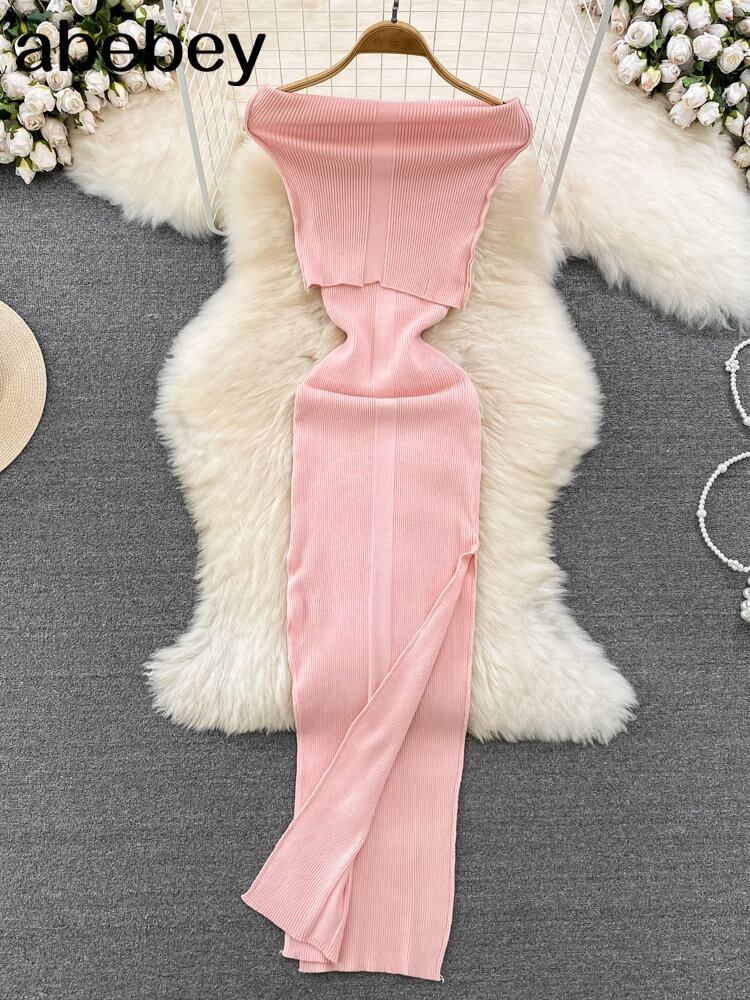 ブルースラッシュネックサマーニットセクシーストラップドレスタンク弾性ウエストボディコンサンドレスビーチスプリットバックレスロングドレス 夏物