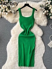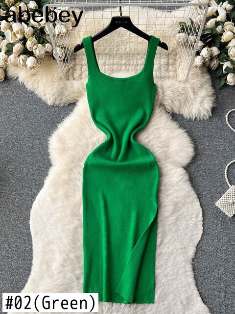 Kaki サマーニットセクシーストラップドレスタンク弾性ウエストボディコンサンドレスビーチスプリットバックレスロングドレス 夏物