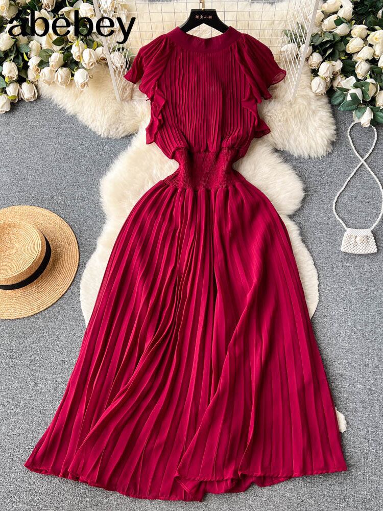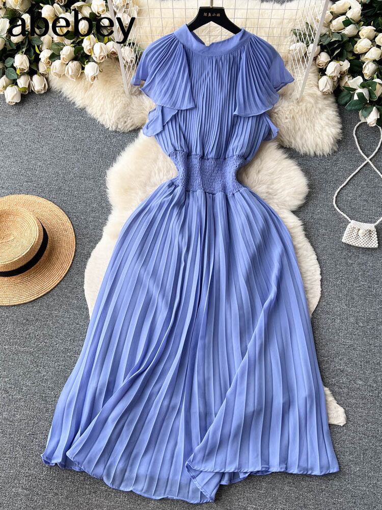 中空アウトシフォンサンドレスフリルプリーツ A ラインロングドレスストリートボヘミアンビーチドレス ラッフル Aライン
