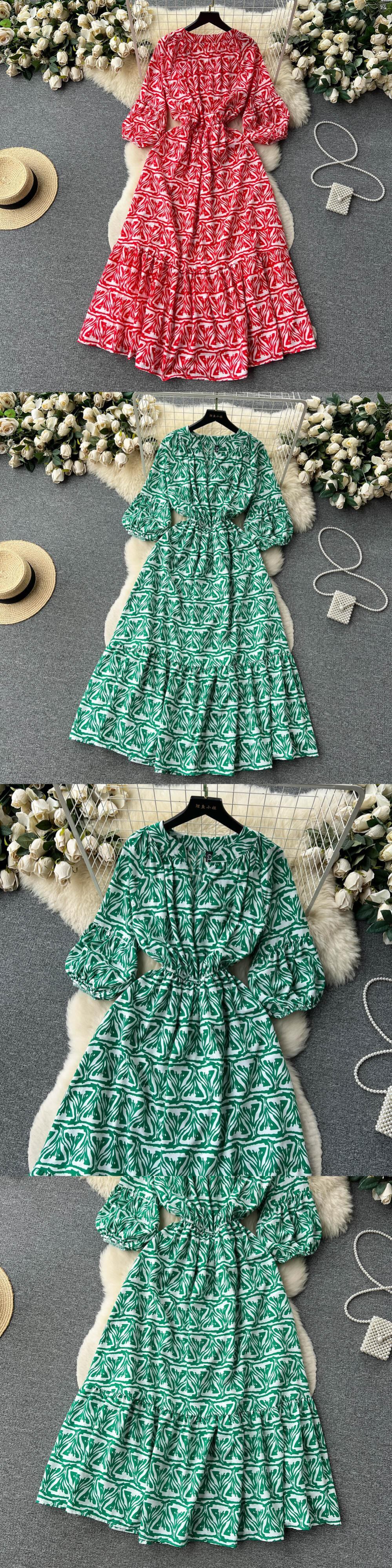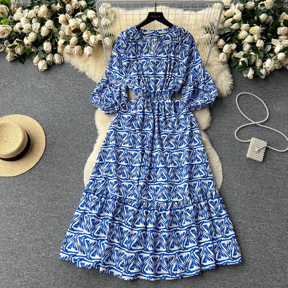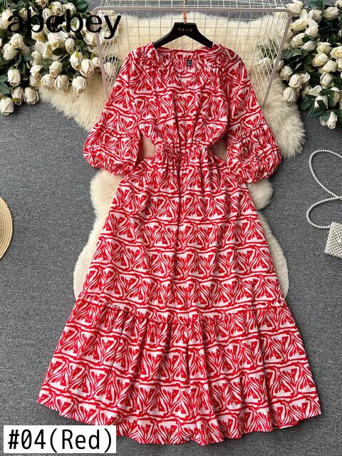 幾何学フレンチロング花柄ドレスストリートパフスリーブレースアップシース V ネック A ラインパーティードレス Vネック Aライン