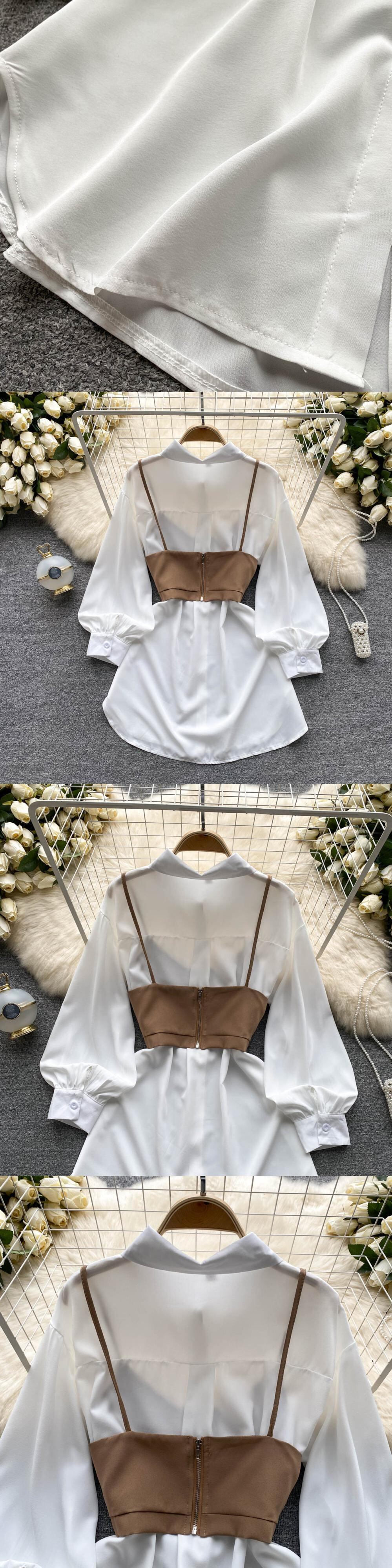 白人特大ユニークツーピース衣装長袖ブラウスベストセットフェミニンシャツシュミーズファム ロング ホワイト