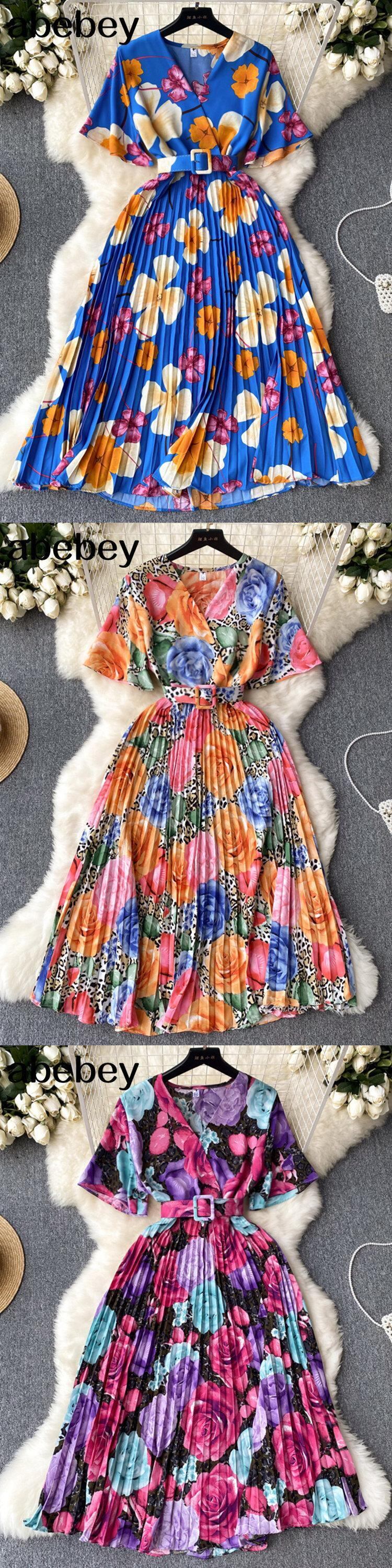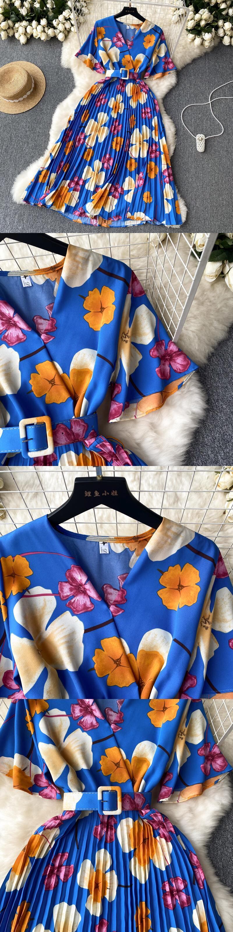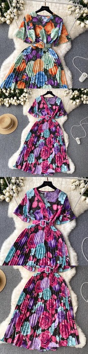 夏秋ボヘミアンタイダイプリントプリーツロングドレスボヘミアン O ネックパフスリーブウエストドレープマキシ Vestido サマー 夏物 オータム 秋物 Oネック