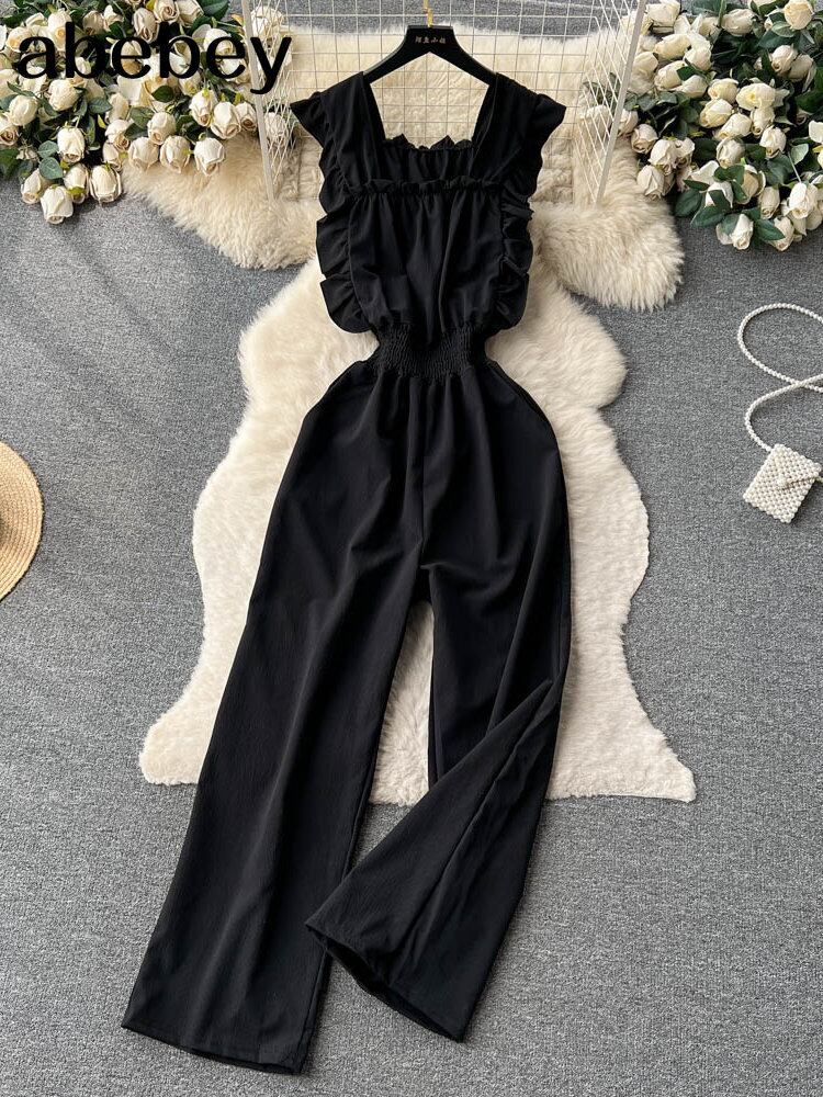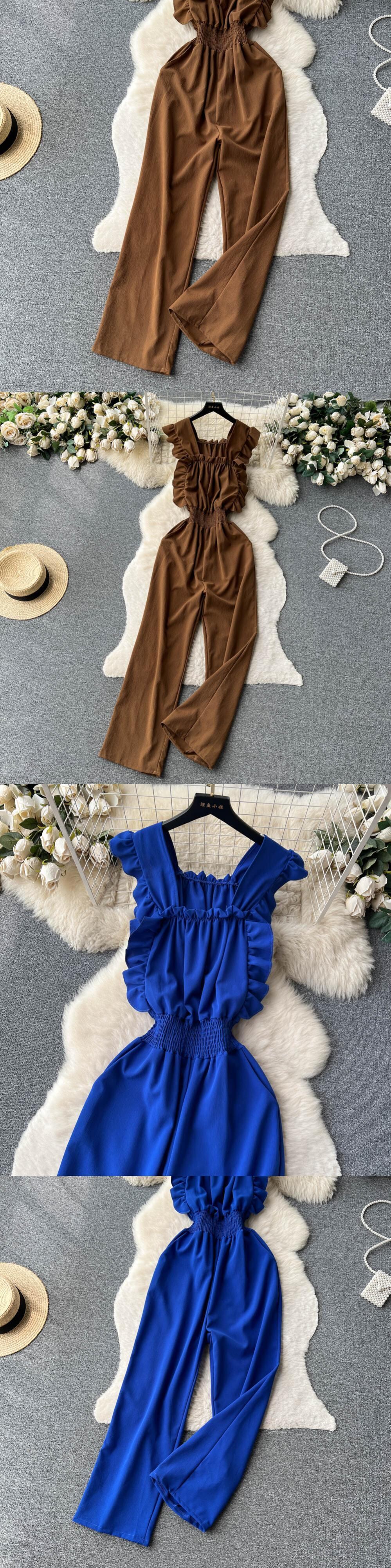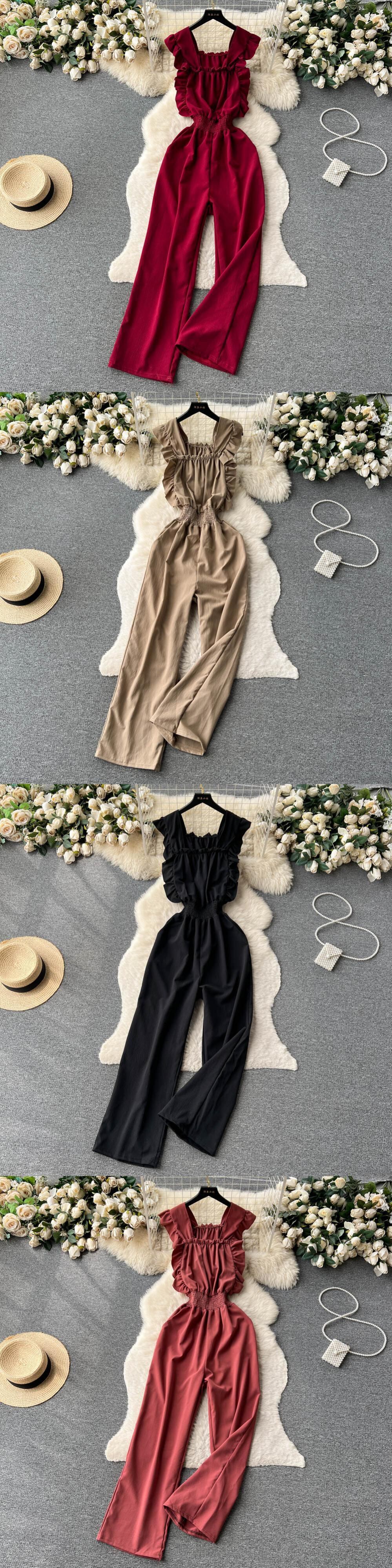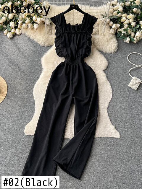夏シニアジャンプスーツフリルスクエア襟フリルロンパースウエストストリートロンパース ラッフル サマー 夏物 ソリッドカラー スクウェア