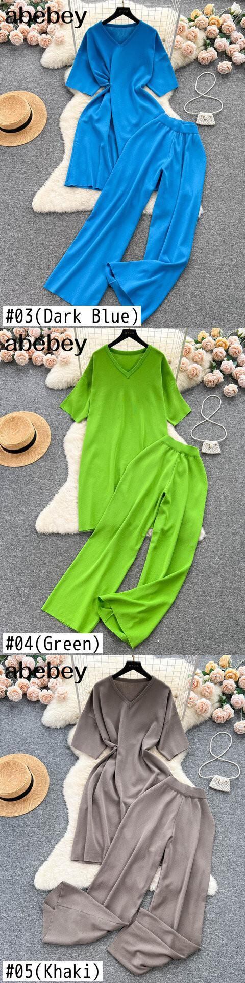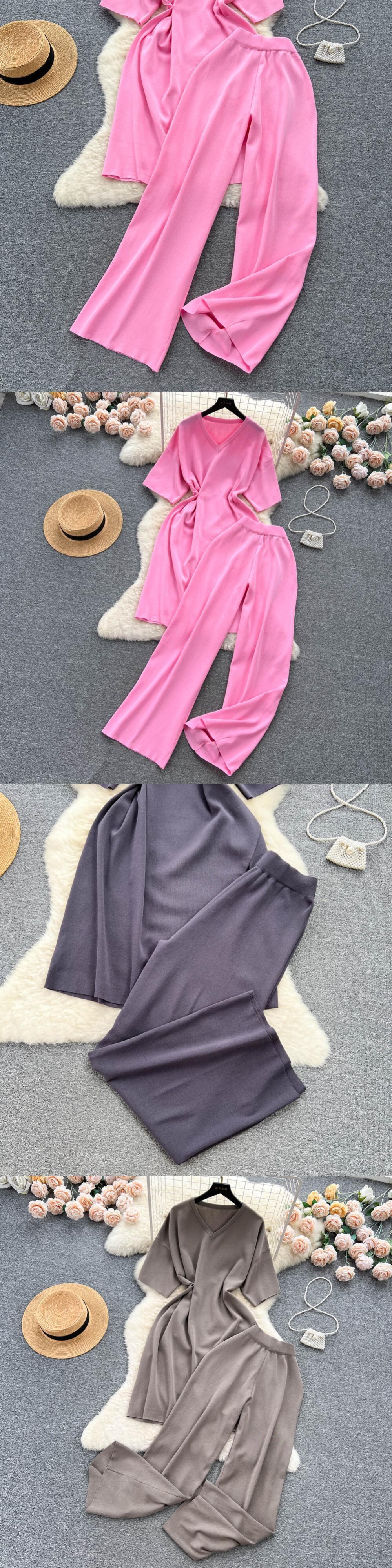サマーニットツーピーススーツ半袖Vネックカーディガンブラウス+ワイドレッグウエストゴム長パンツセット ショート ロング ハーフスリーブ エラスティック 伸縮 夏物 ワイドパンツ