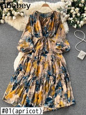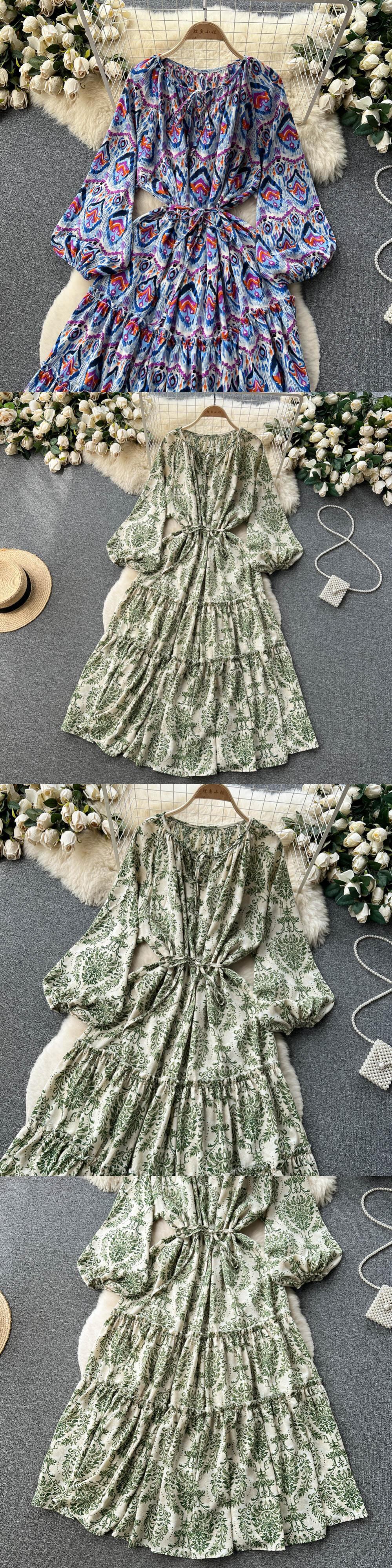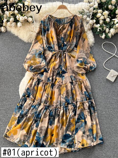 フレンチロング花柄ドレスストリートパフスリーブレースアップシースOネックAラインパーティードレス