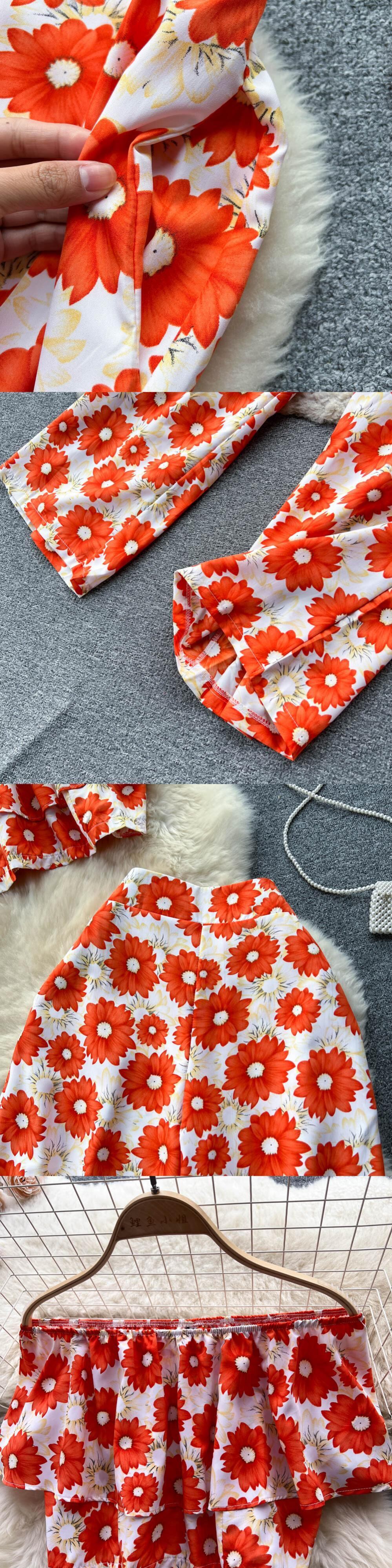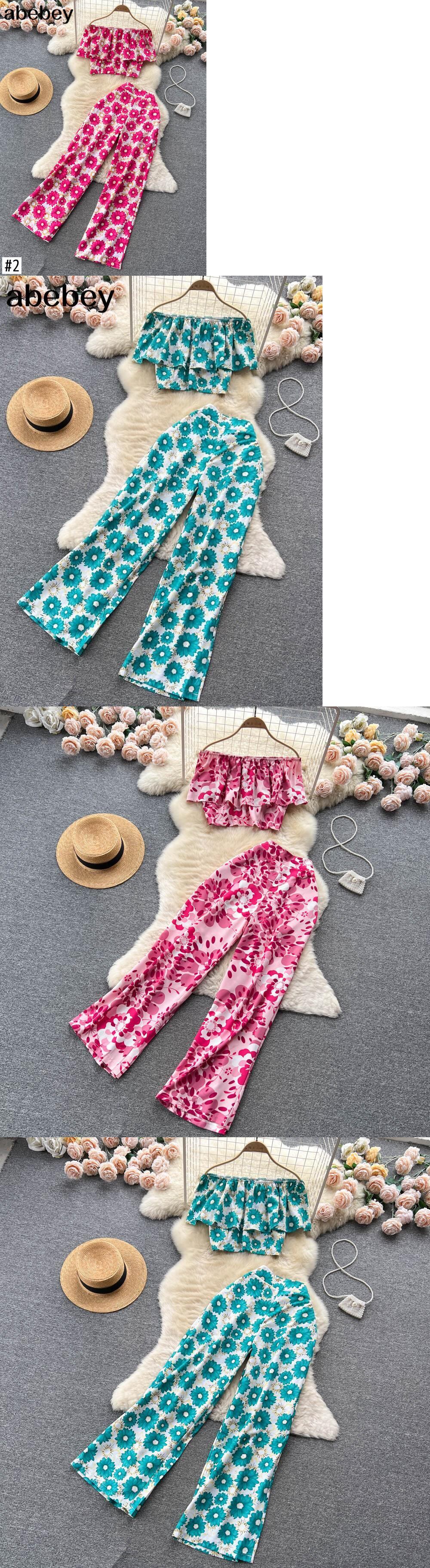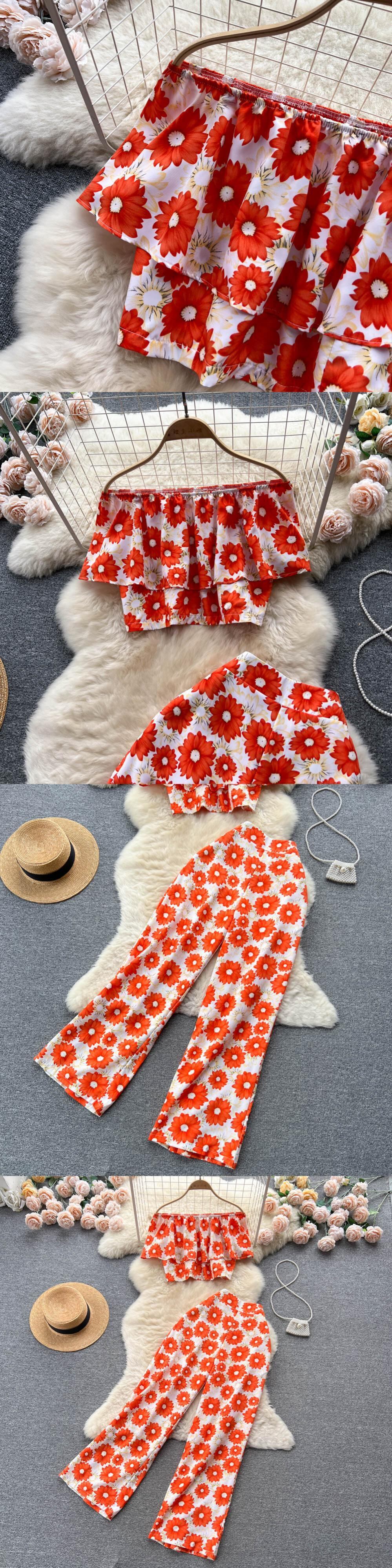 夏ボヘミアン花柄セットパフスリーブショートトップス + ウエストプリーツワイドレッグロングパンツ 2 枚スーツ サマー 夏物 ワイドパンツ