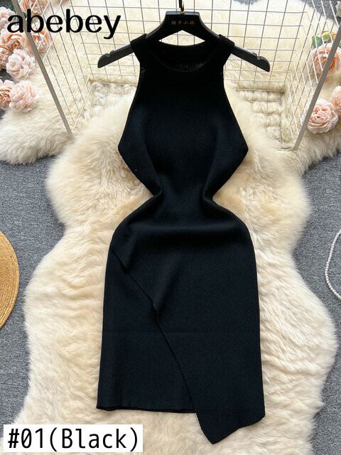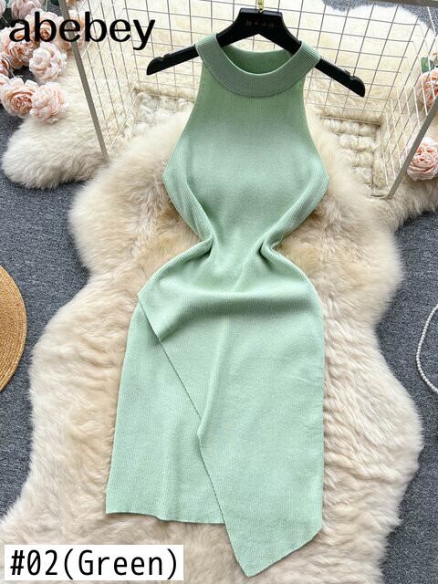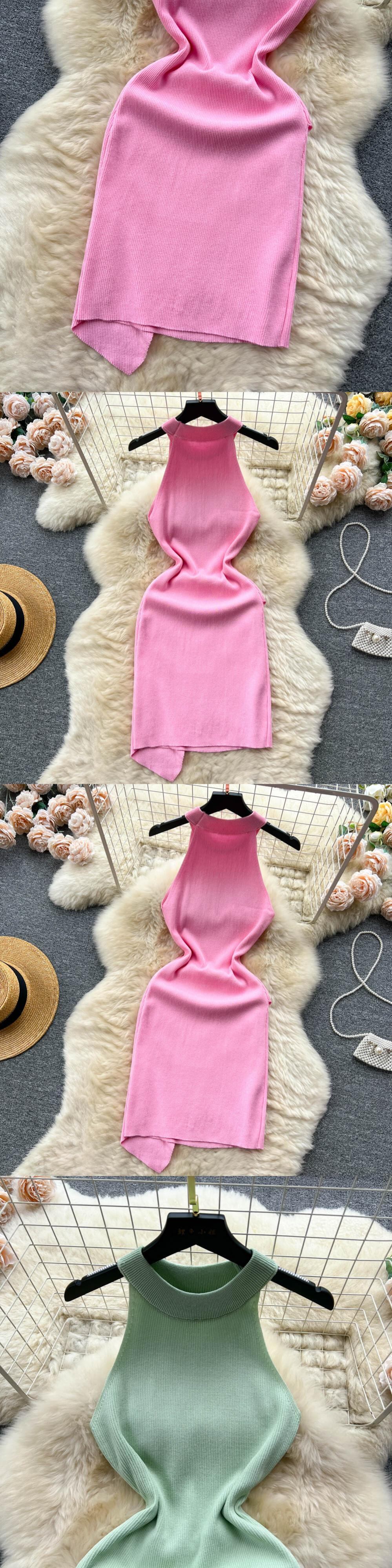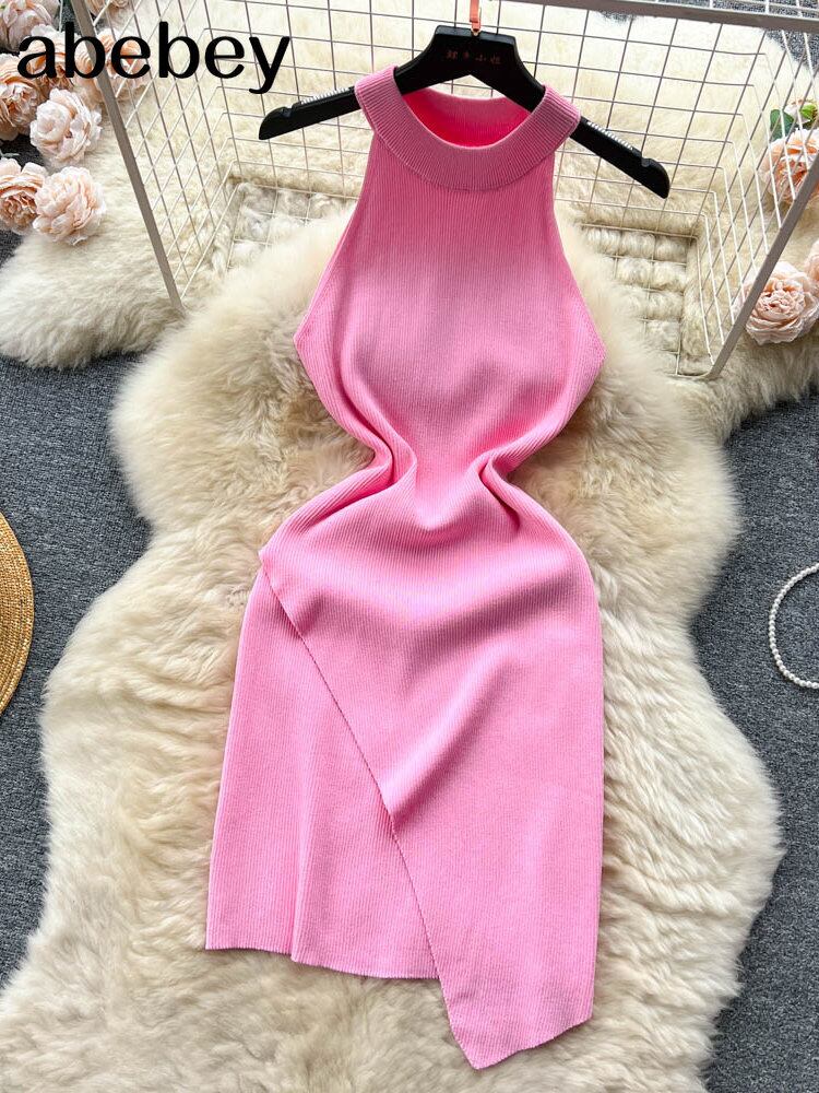 ピンク夏ホルターニットセクシーストラップドレスタンク弾性ウエストボディコンサンドレスビーチミニドレス サマー 夏物