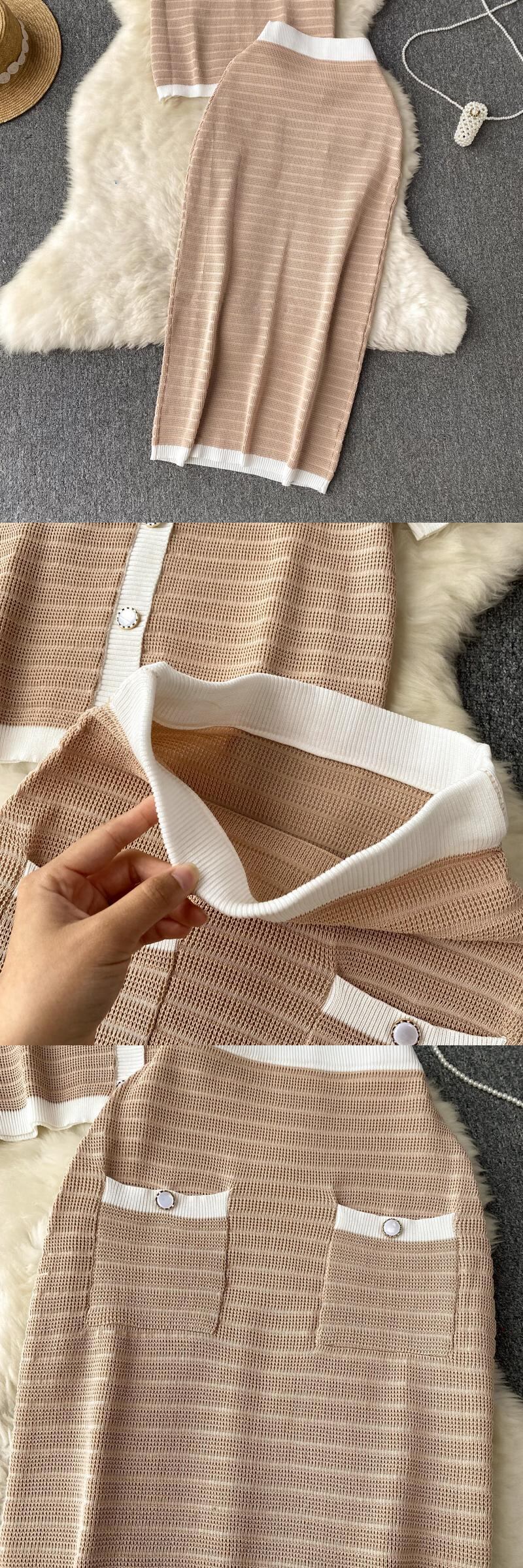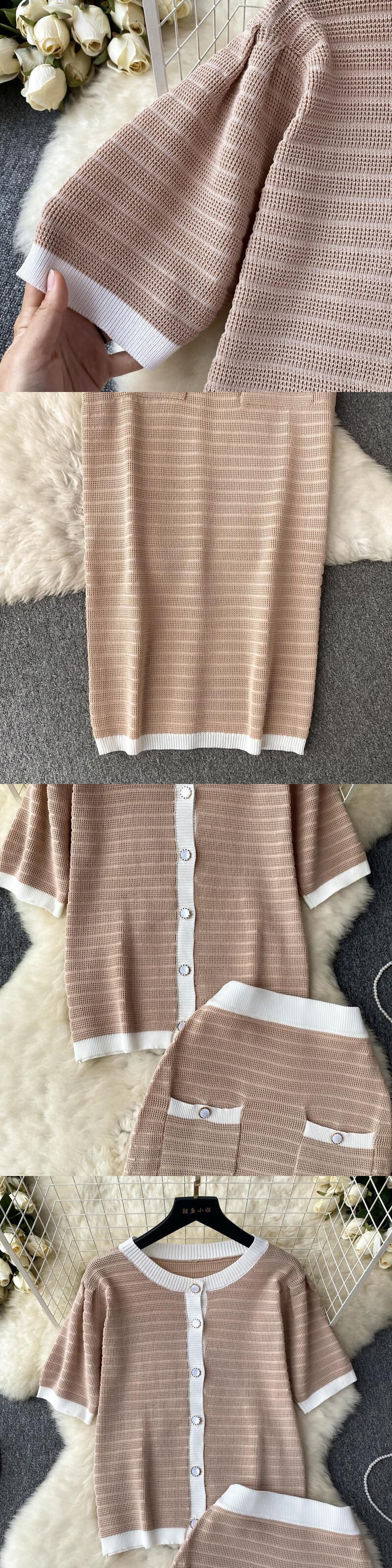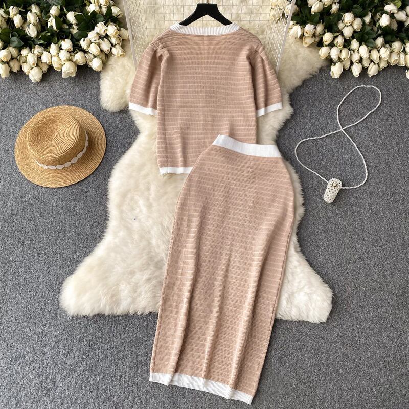 ニットルーズスーツ夏 O ネック半袖トップ + スリムロングスカート薄手中空アウト 2 個セット ショート ハーフスリーブ サマー 夏物 Oネック