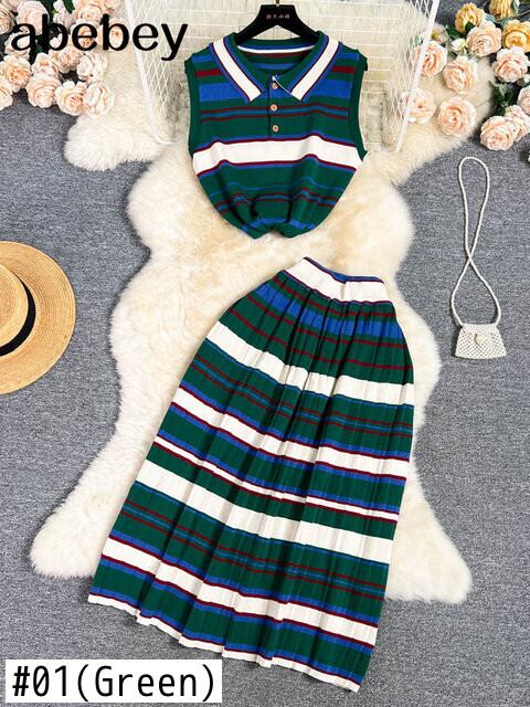 ストリップニットツーピースセットノースリーブセクシーショートクロップトップ+弾性ウエストニットロングスカートスーツ エラスティック 伸縮