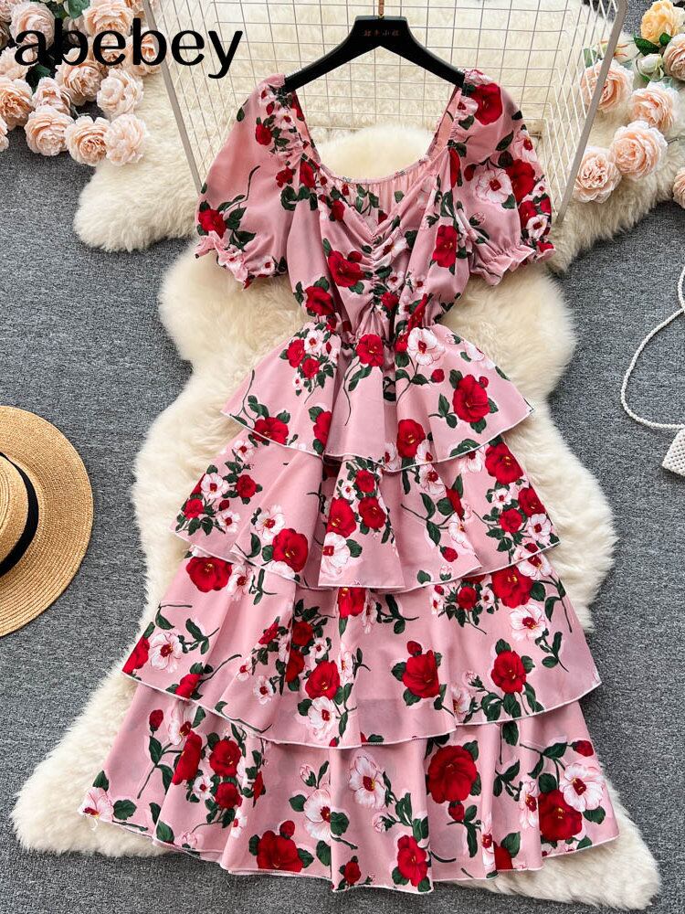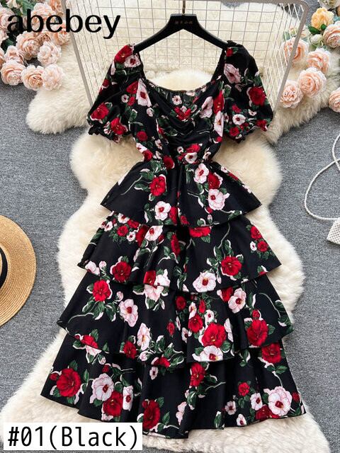 サマードレス年齢削減 Vestidos スクエアネックスリム甘い花蓮葉ミディドレス 大人ガーリー スウィート キュート カジュアル 夏物 花柄 スクウェア