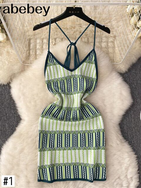 ホルターストリップサマーニットセクシーストラップドレスタンク弾性ウエストボディコンサンドレスビーチスプリットバックレスショートドレス 夏物