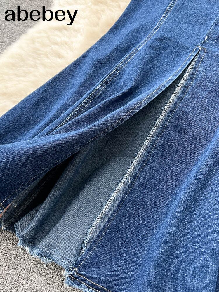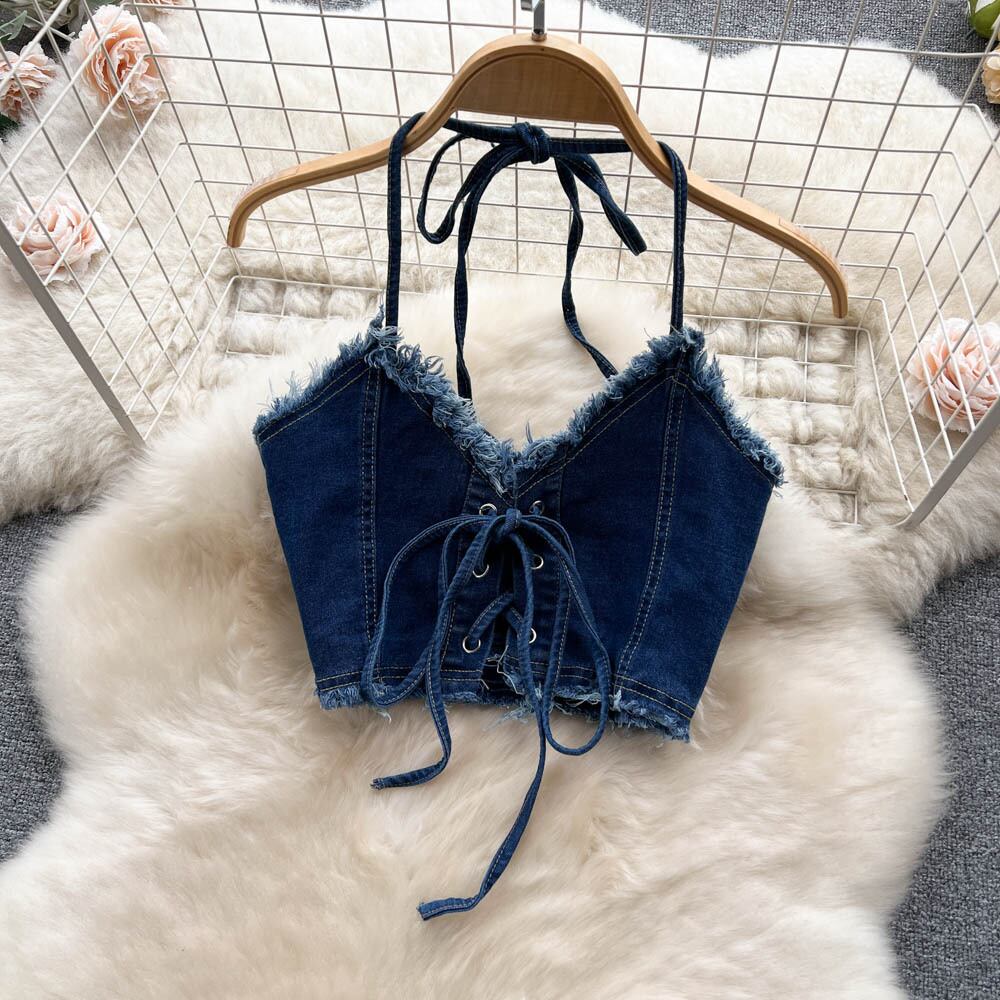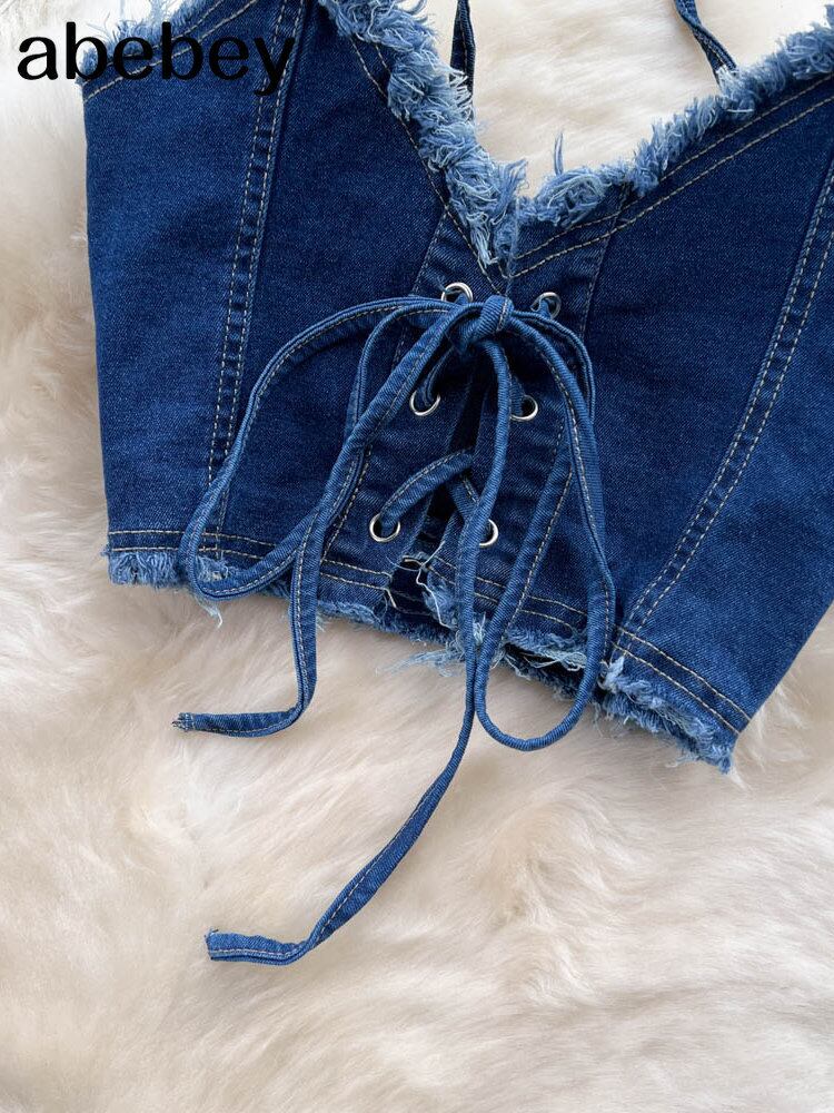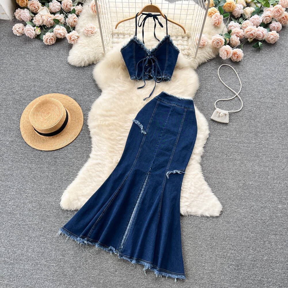 夏デニム 2 点セットセクシーマッチングセットホルタークロップトップスとボディコンロングスカート 2 点セット衣装 サマー 夏物