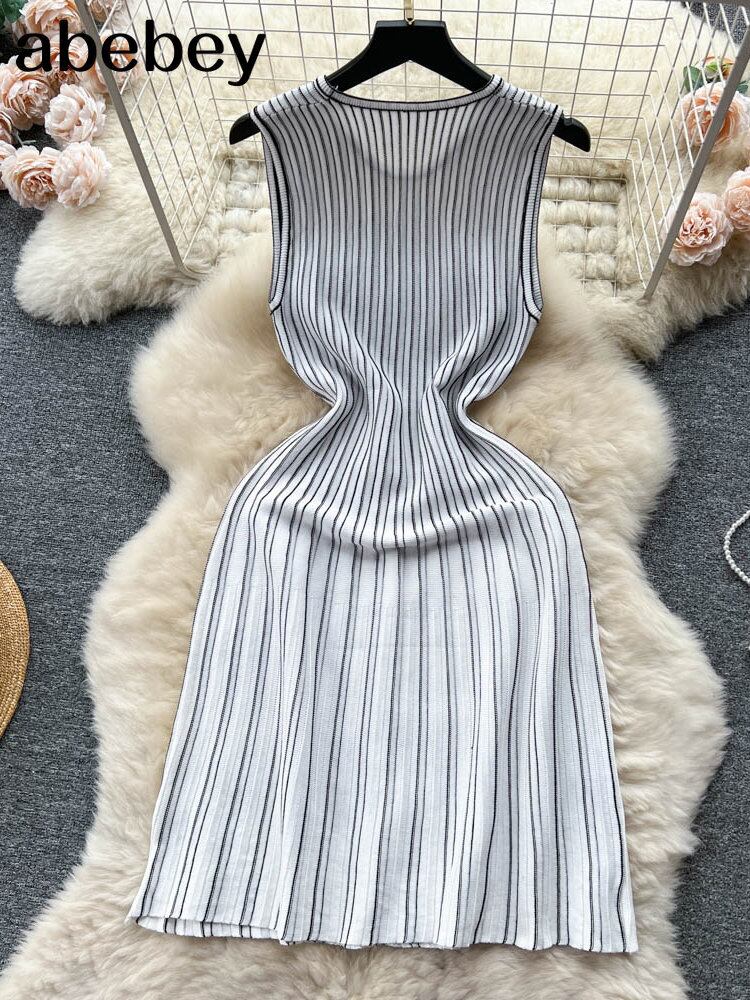 サマーニットセクシーストラップドレスタンク弾性ウエストボディコンサンドレスビーチ背中開いたロングドレス 夏物