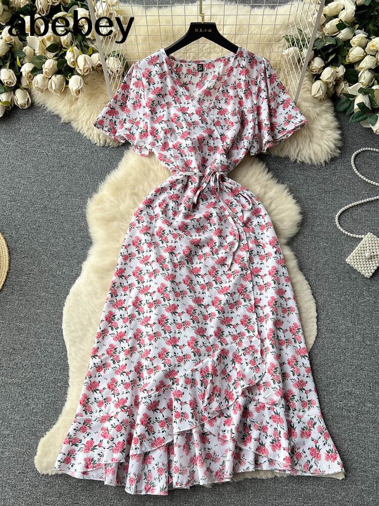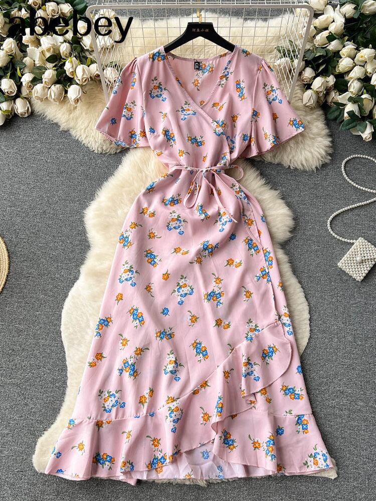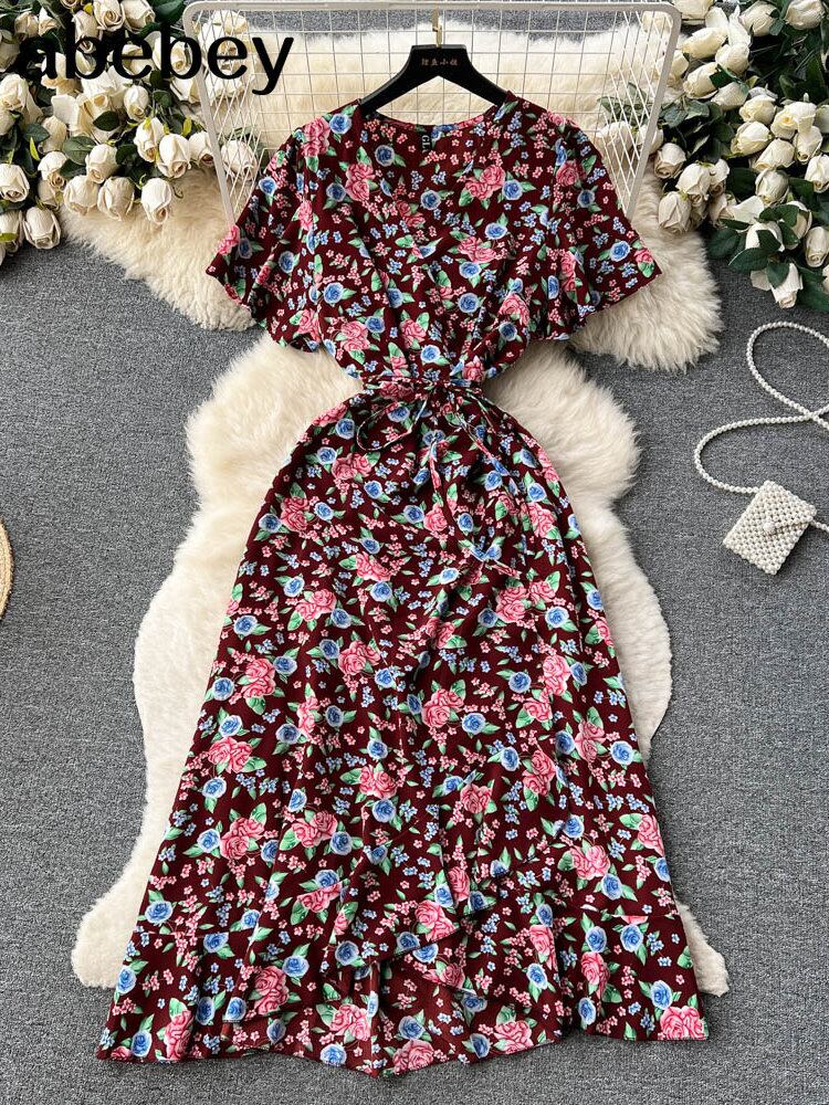 花柄ロングドレス半袖レトロ A ラインサンドレス夏ボヘミアンビーチマキシドレス ショート ハーフスリーブ サマー 夏物 Aライン