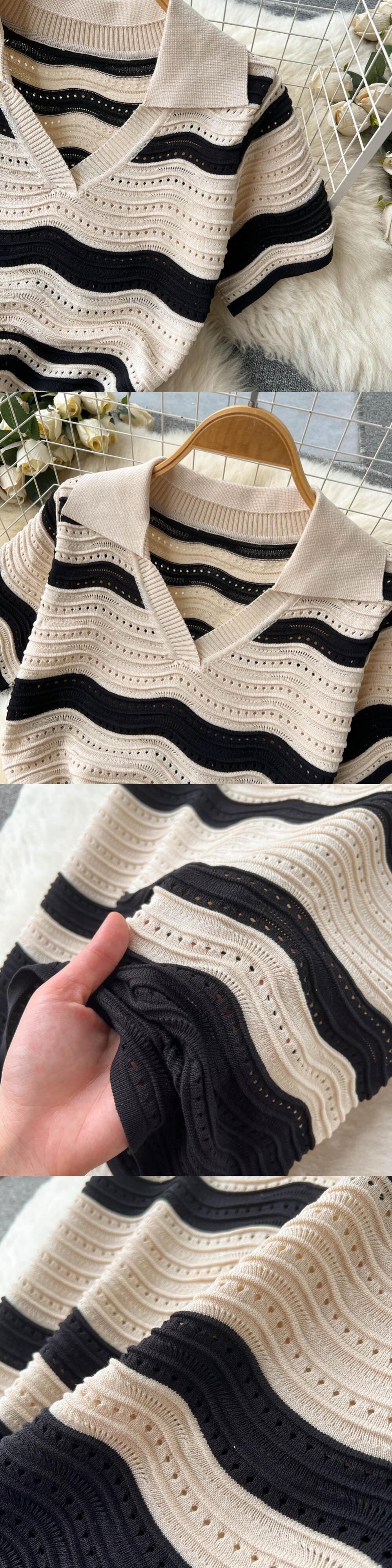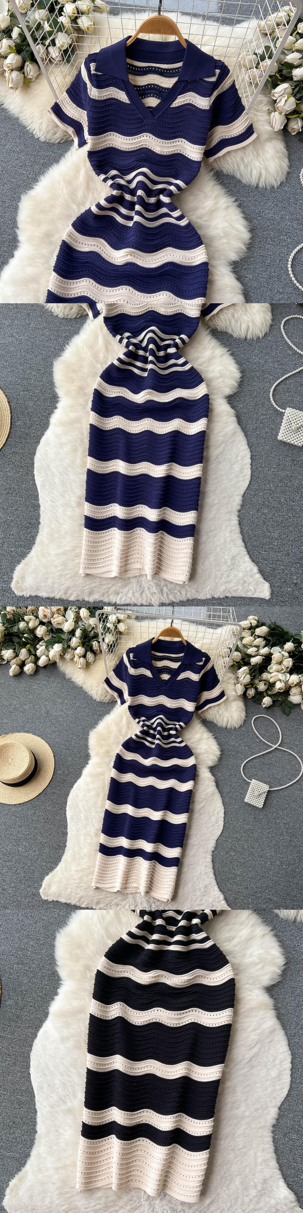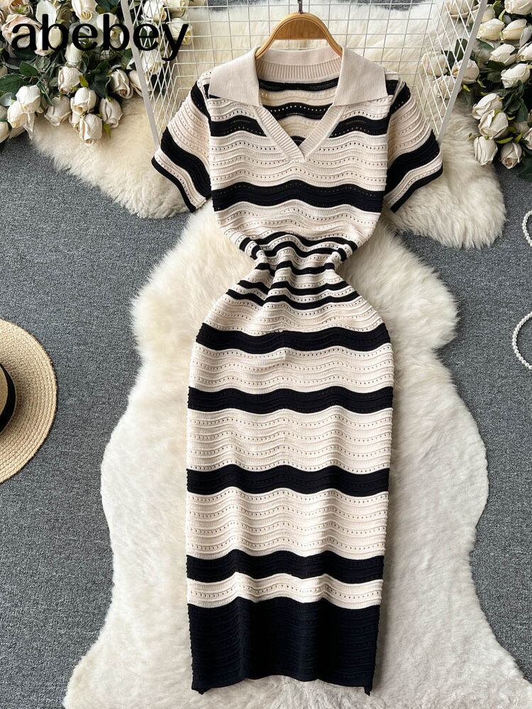 半袖ストライプロングドレスラペルネック中空アウトスリムボディコンサンドレスホットスウィートニットビーチミディドレス ショート ハーフスリーブ 大人ガーリー キュート カジュアル