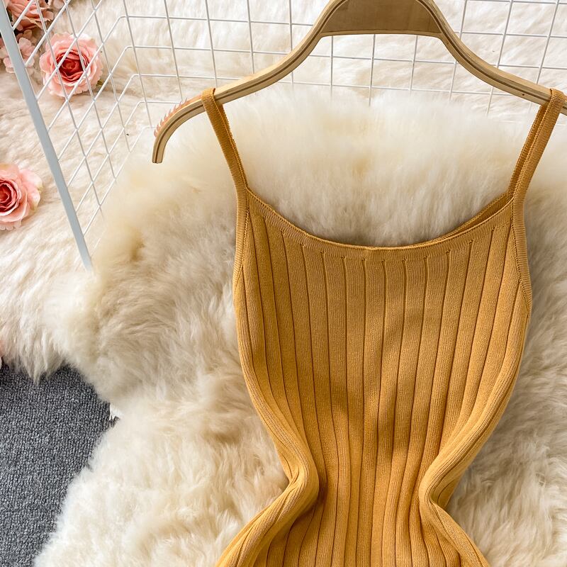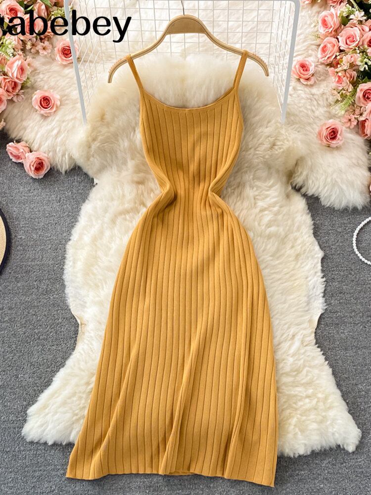 黄色サマーニットセクシーストラップドレスタンク弾性ウエストボディコンサンドレスビーチ背中開いたロングドレス 夏物