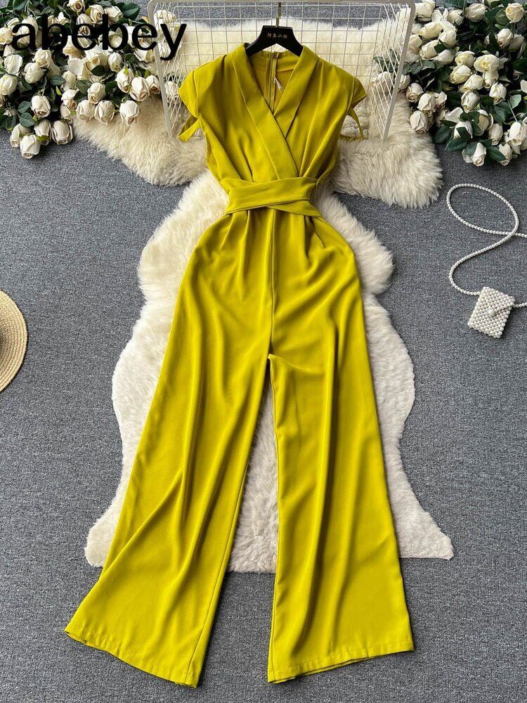 セクシーロングジャンプスーツ夏 V ネック Temperamet ベルトノースリーブシースストリートレトロロンパース サマー 夏物 ハーネス Vネック ソリッドカラー