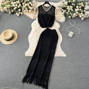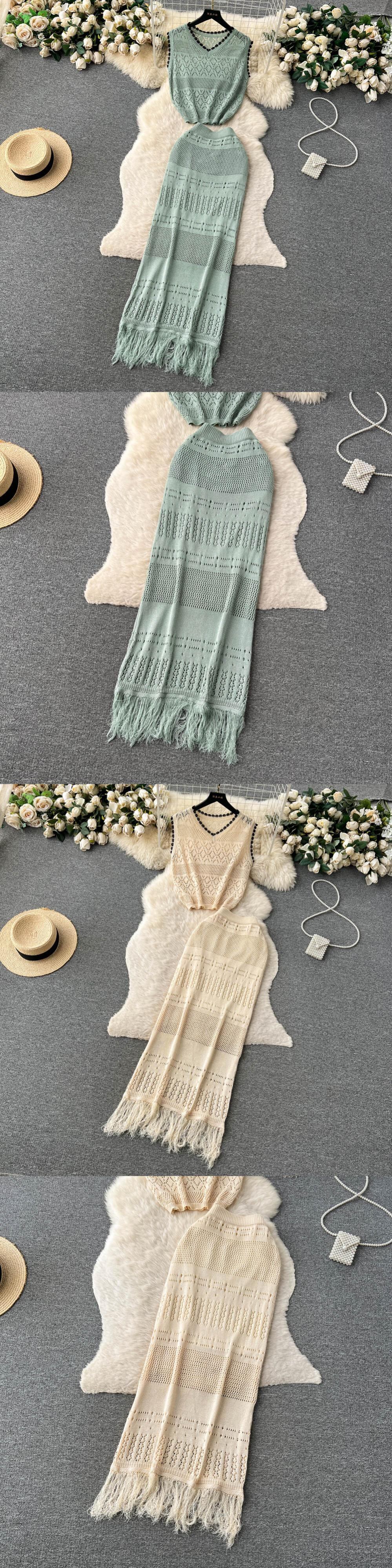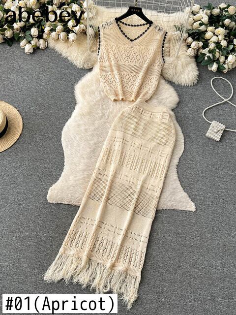 Tel 優しいニットスーツ V ネック半袖トップ + 弾性ウエストボディコンスカート中空アウト 2 枚セット ショート ハーフスリーブ エラスティック 伸縮 Vネック