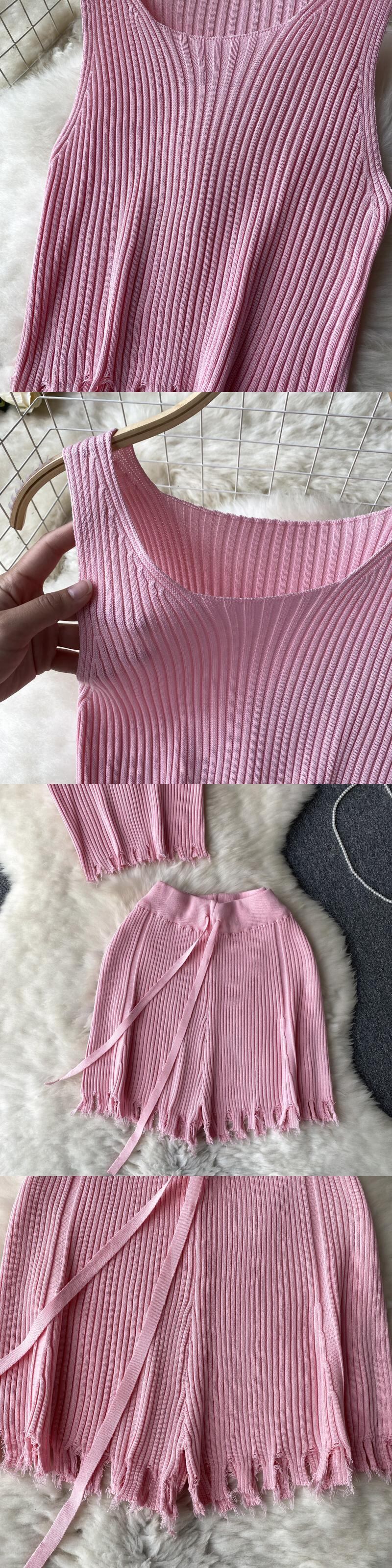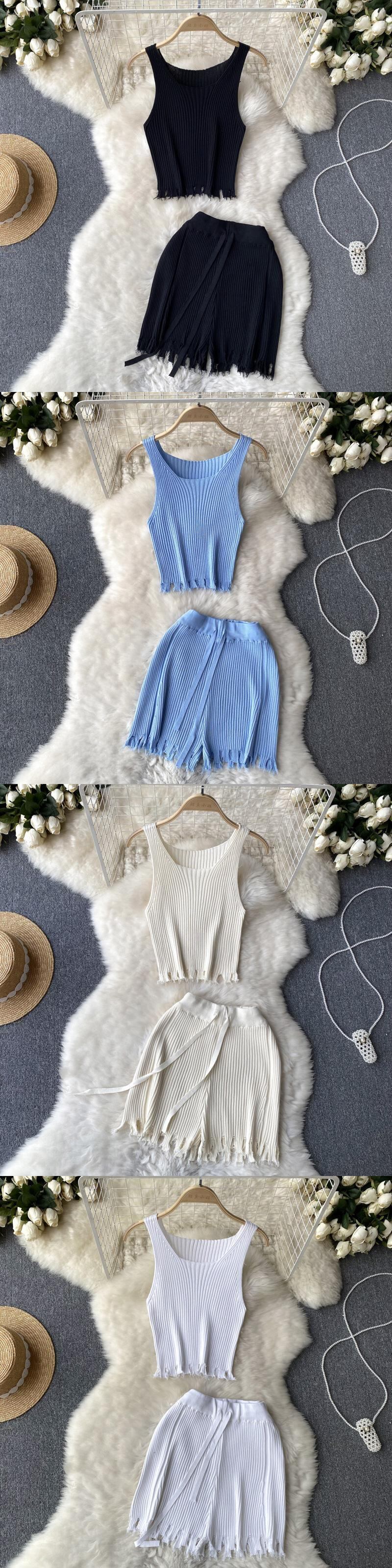 ニットツーピーススーツフック中空アウト電話キャミソール弾性ウエストショーツビーチスタイルマッチングセット夏 エラスティック 伸縮 サマー 夏物 ブルマー