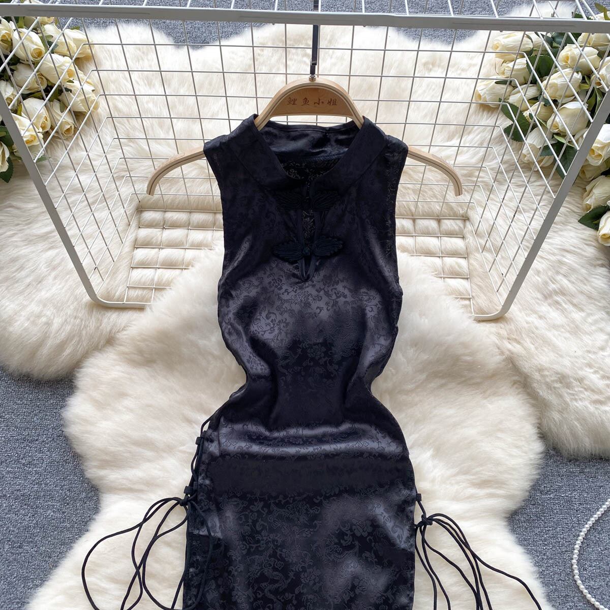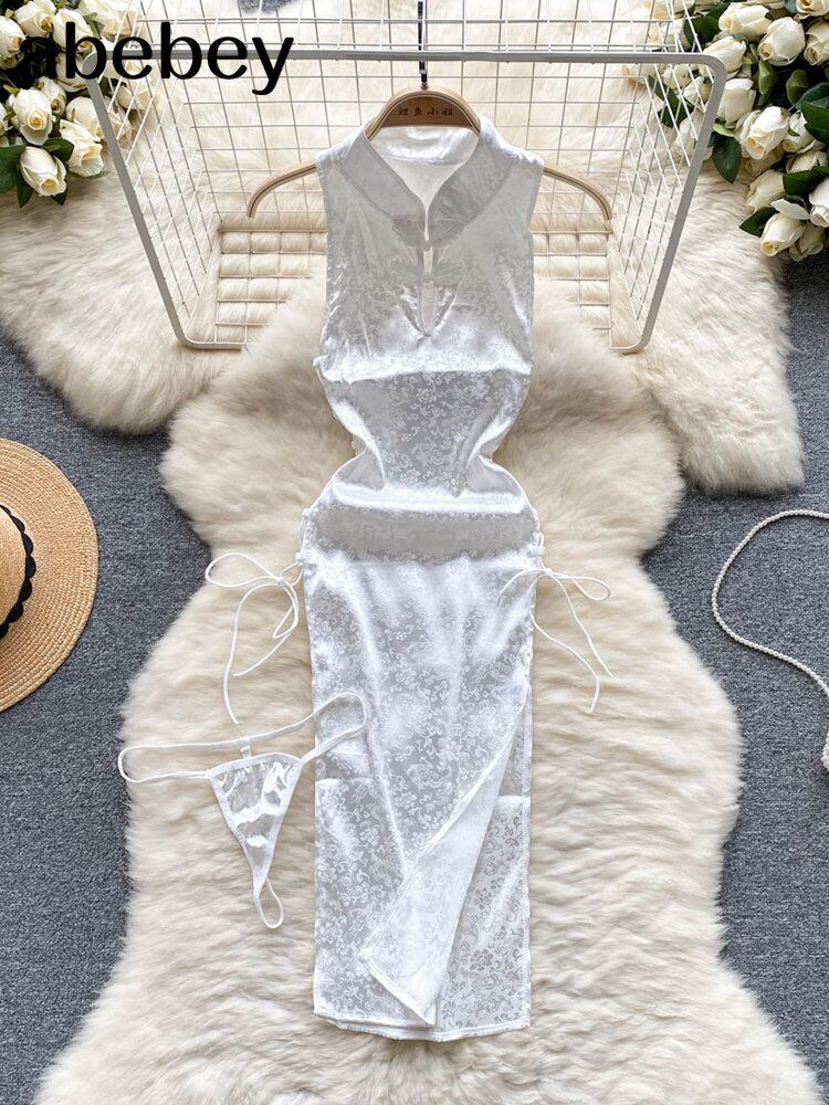 セクシーレースアップスプリットロングドレスシース中空アウトノースリーブシェイプウェアチャイナスリムエロセクシードレス