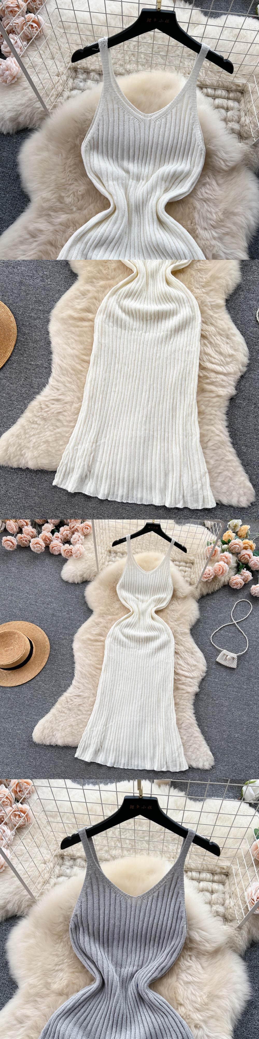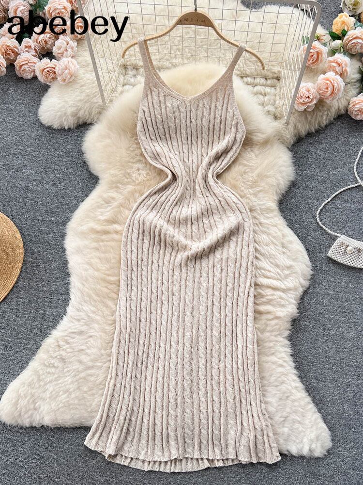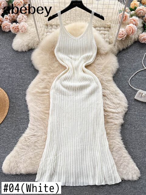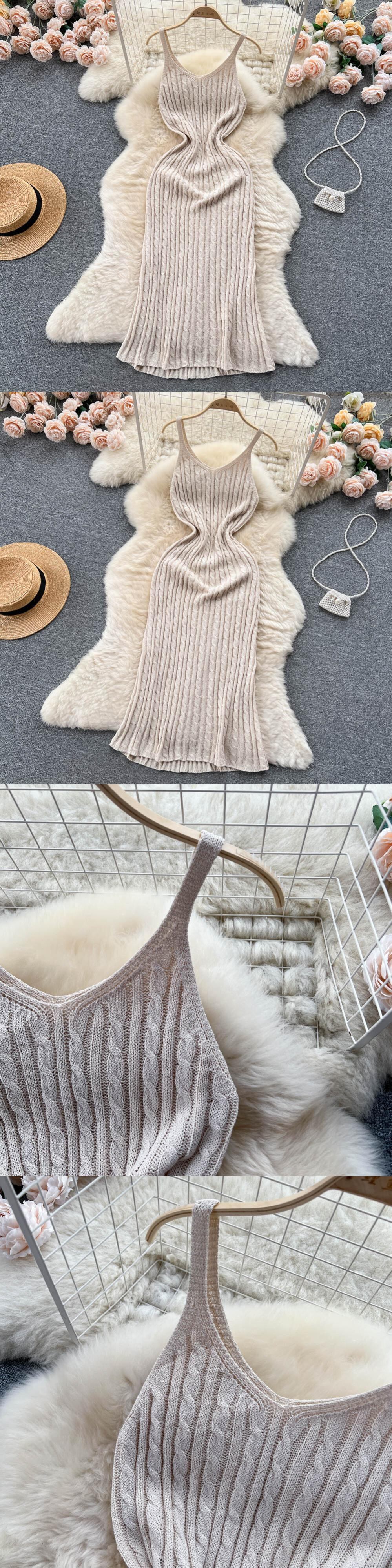 ストリートビーチサンドレススパゲッティストラップ A ラインニットドレス休暇バックレスロングドレス Aライン ソリッドカラー