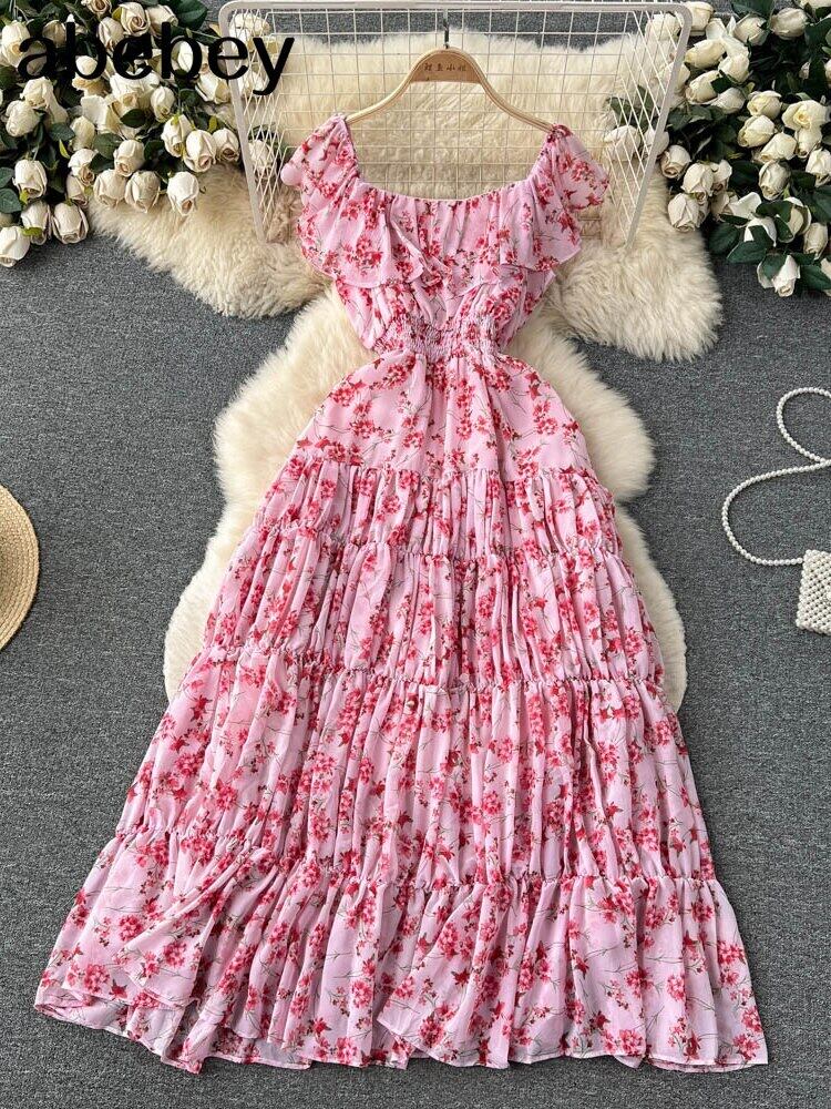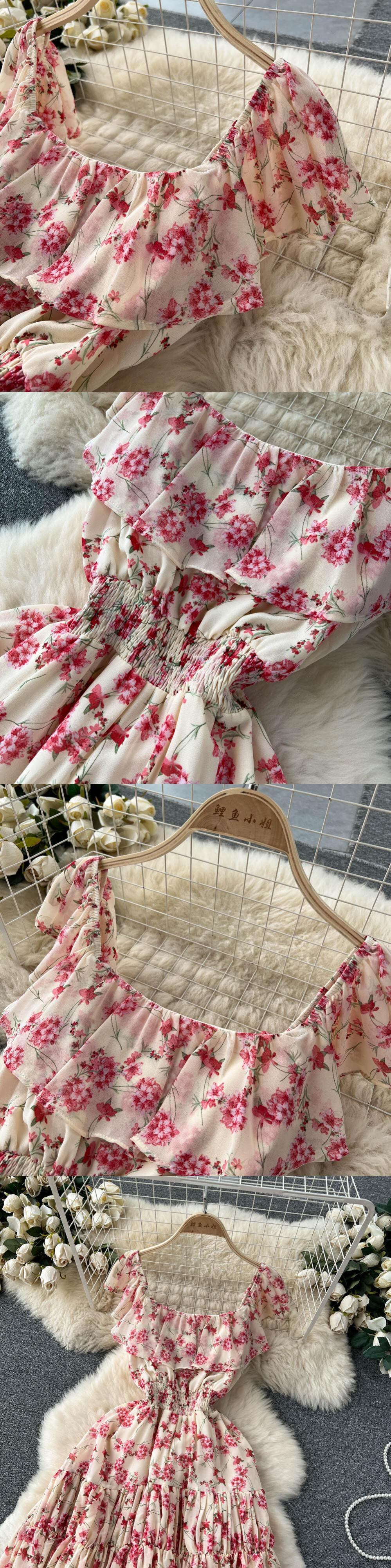 夏ロングドレス正方形襟ノースリーブシャーリングプリーツ弾性ウエストプリント優しい休日ビーチ A ラインサンドレス エラスティック 伸縮 サマー 夏物 Aライン
