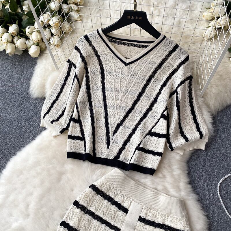 優しいニットスーツ v ネック半袖トップ + 弾性ウエストボディコンスカート中空アウト 2 枚セット ショート ハーフスリーブ エラスティック 伸縮 Vネック