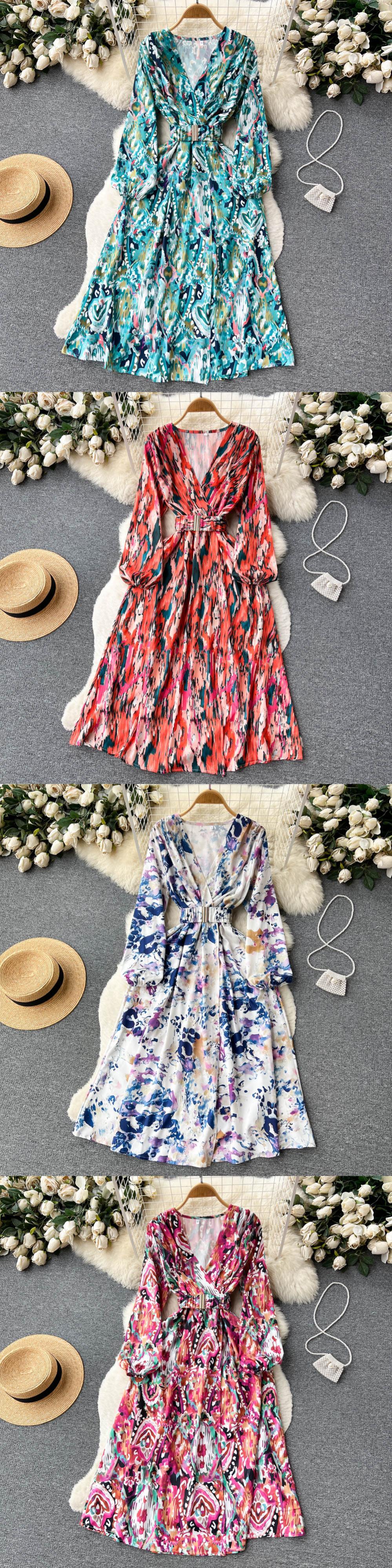 ビーチスタイルスリットレディプリントボヘミアンドレス長袖 V ネックパーティーマキシドレス花ウエストサマードレス ロング 夏物 花柄 Vネック