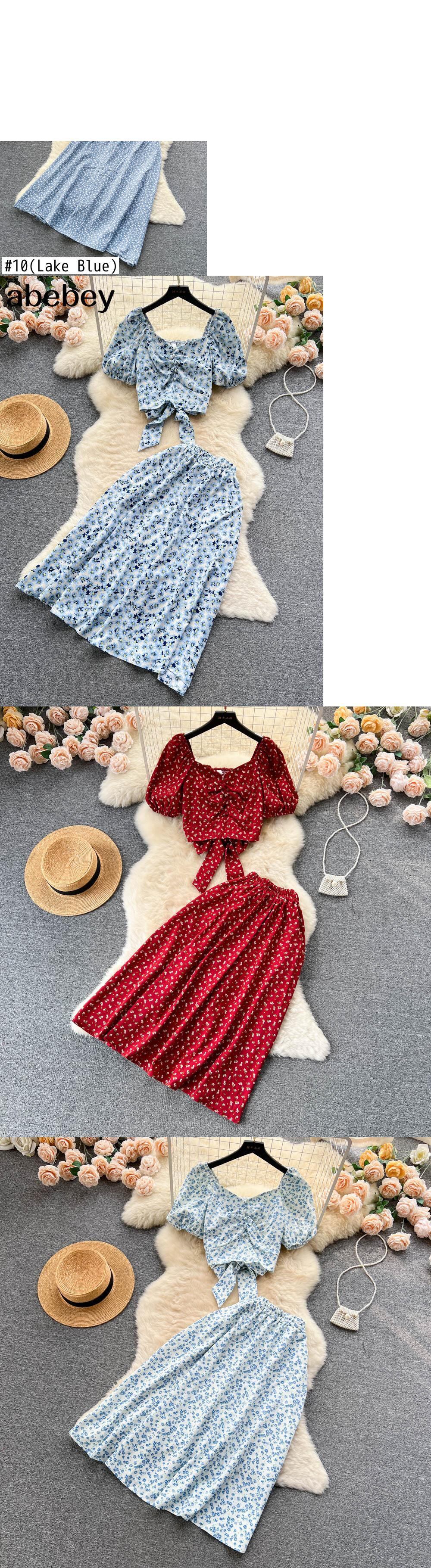 夏プリントビーチ 2 個セットレースアップ花トップ + 弾性ウエストロングスカートストリート休暇シフォンボヘスーツ エラスティック 伸縮 サマー 夏物 花柄