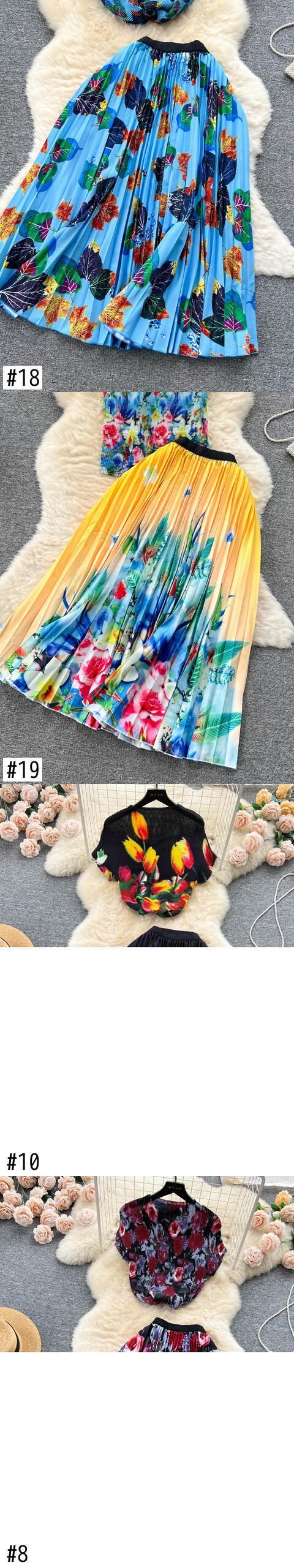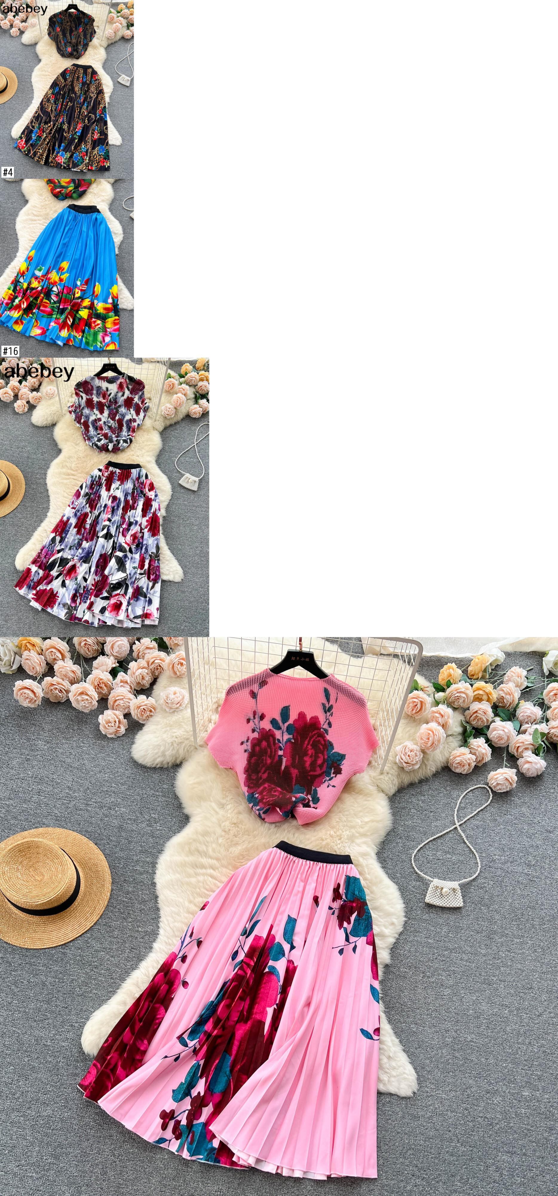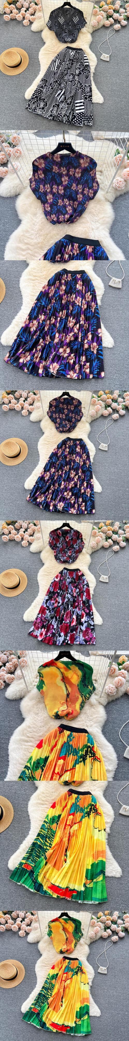 SummerBohemian バケーションビーチ 2 個セット花柄プリント半袖トップスとウエストプリーツロングスカートスーツ ショート ハーフスリーブ サマー 夏物