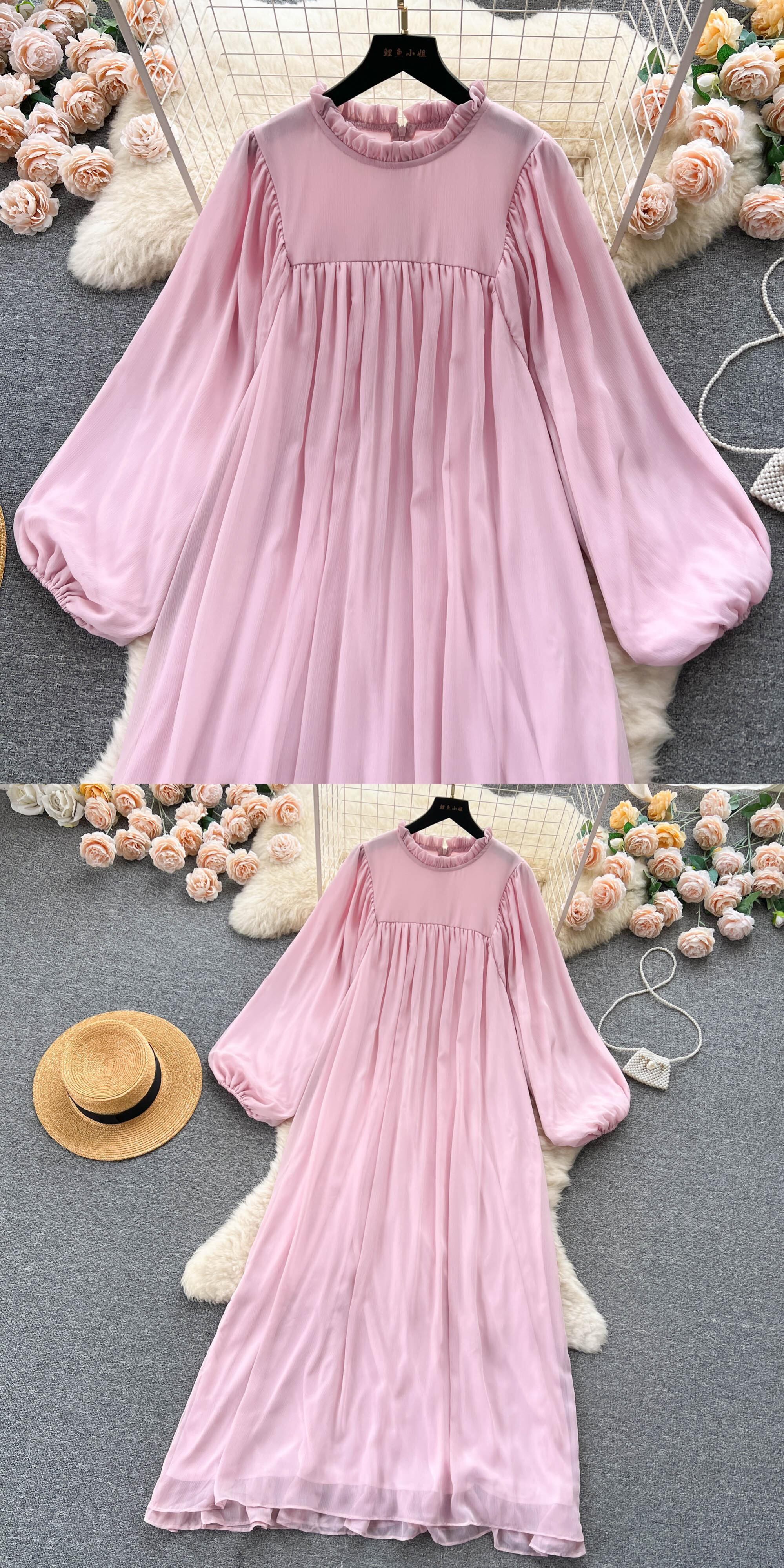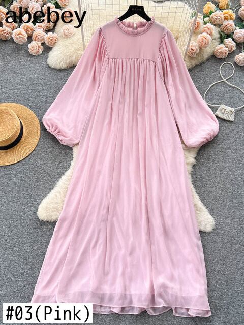 ピンクフレンチロングシフォンドレスストリートパフスリーブレースアップシースoネックaラインパーティードレス ソリッドカラー