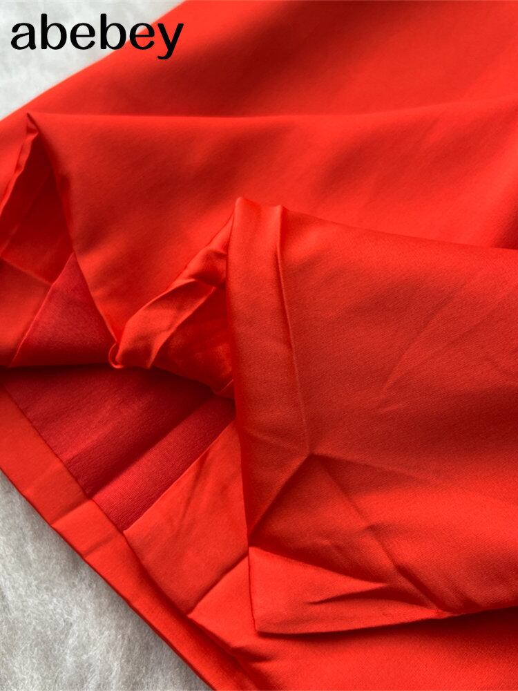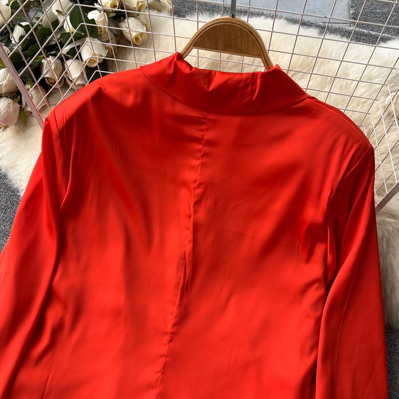 ギャザーサテンミニドレスVネック長袖ドレスVestidos ロング レッド