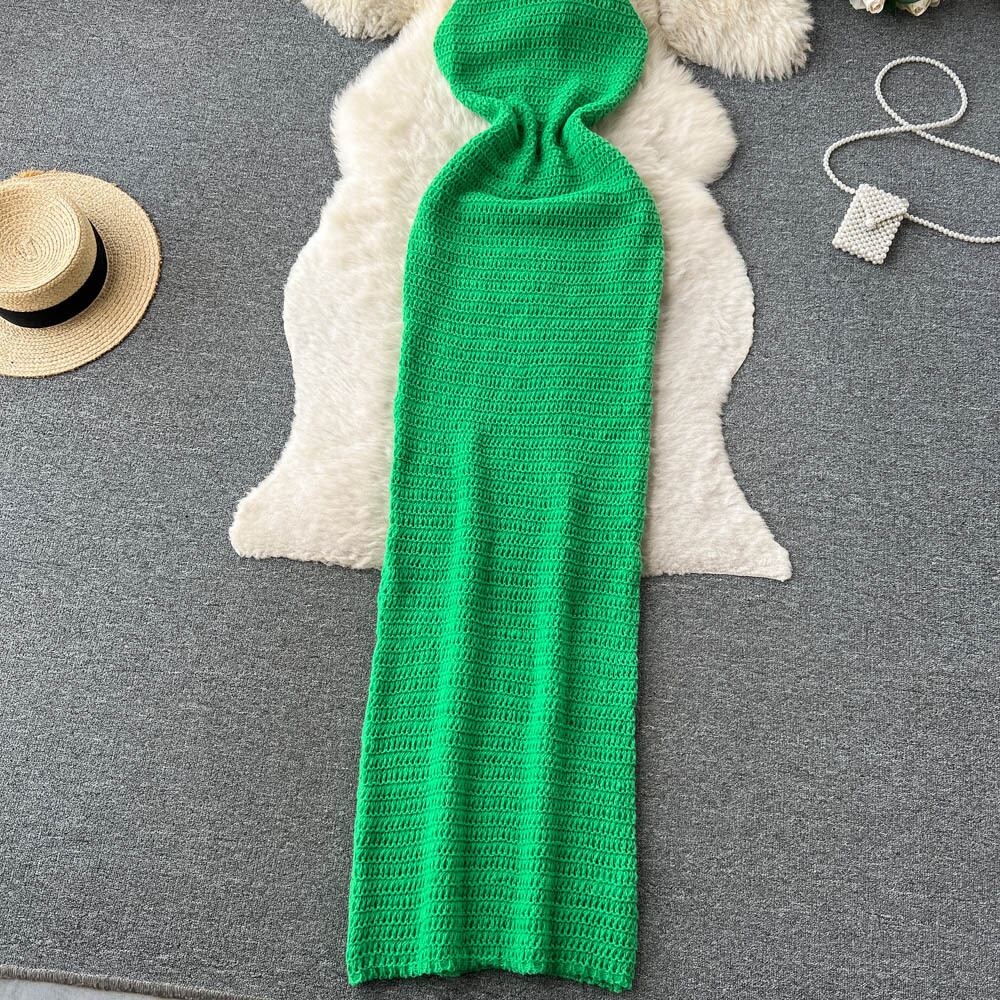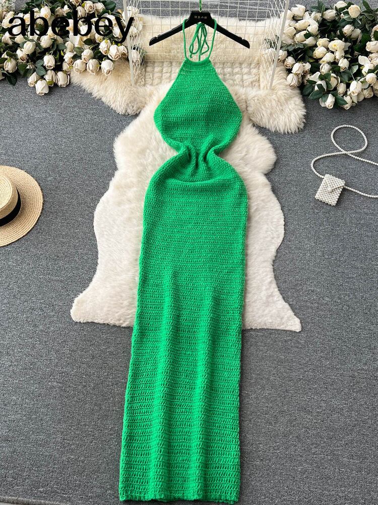 セクシー背中開いたホルターロングドレスレースアップノースリーブシースサンドレス夏ストラップボディコンニットパーティードレス サマー 夏物