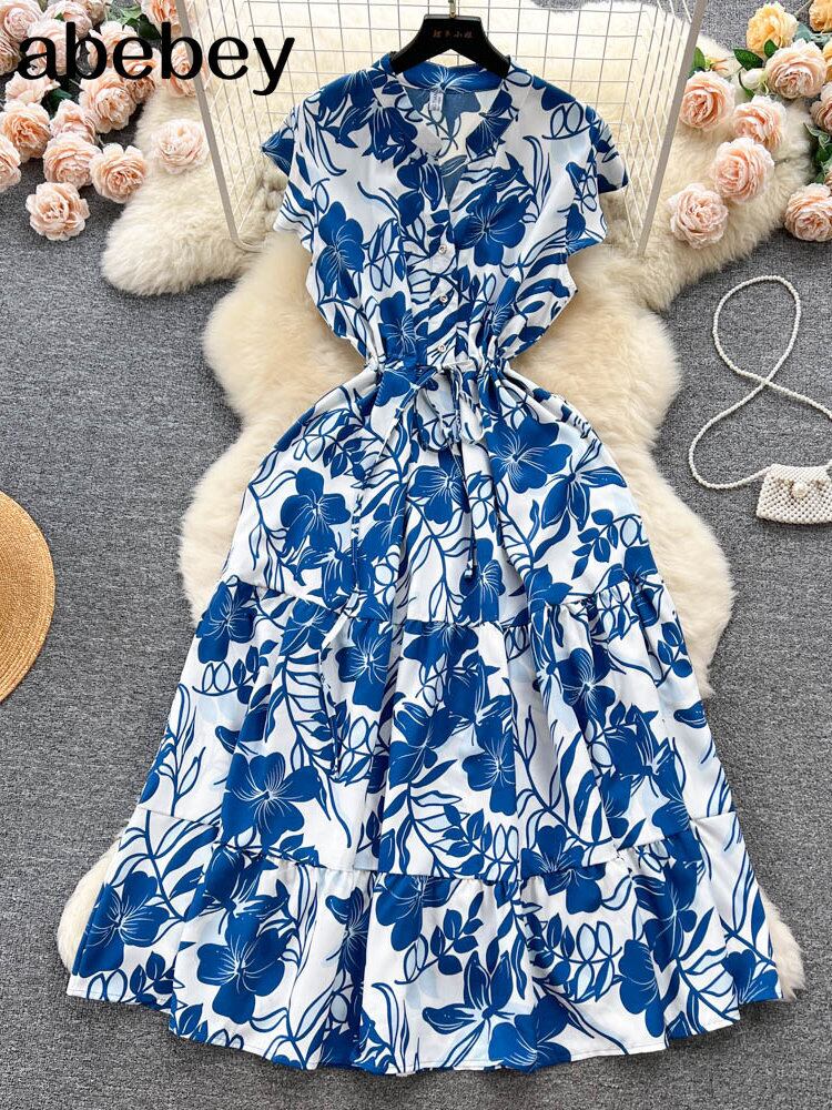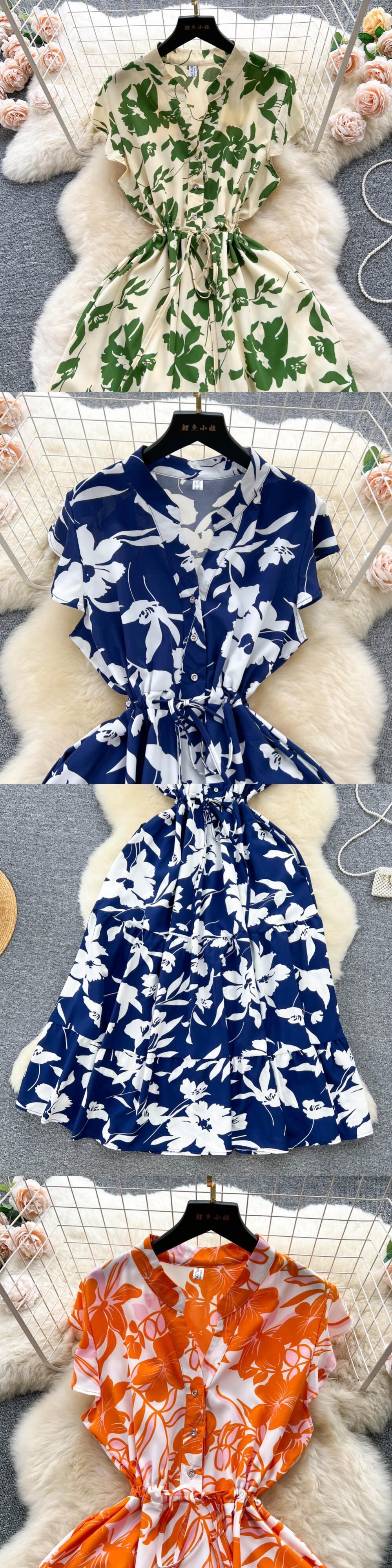 花柄シフォンドレスボウカラーフライングスリーブフリルプリーツ弾性ウエストフランスロングサンドレス リボン ラッフル エラスティック 伸縮