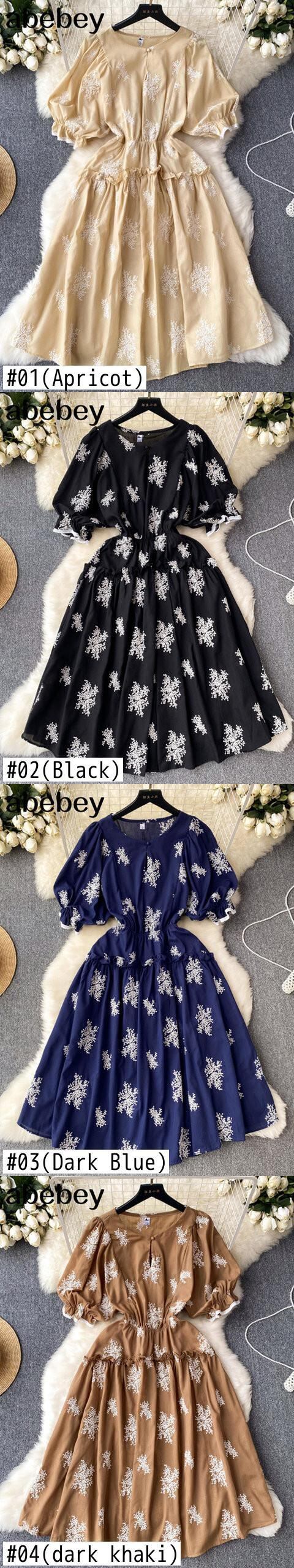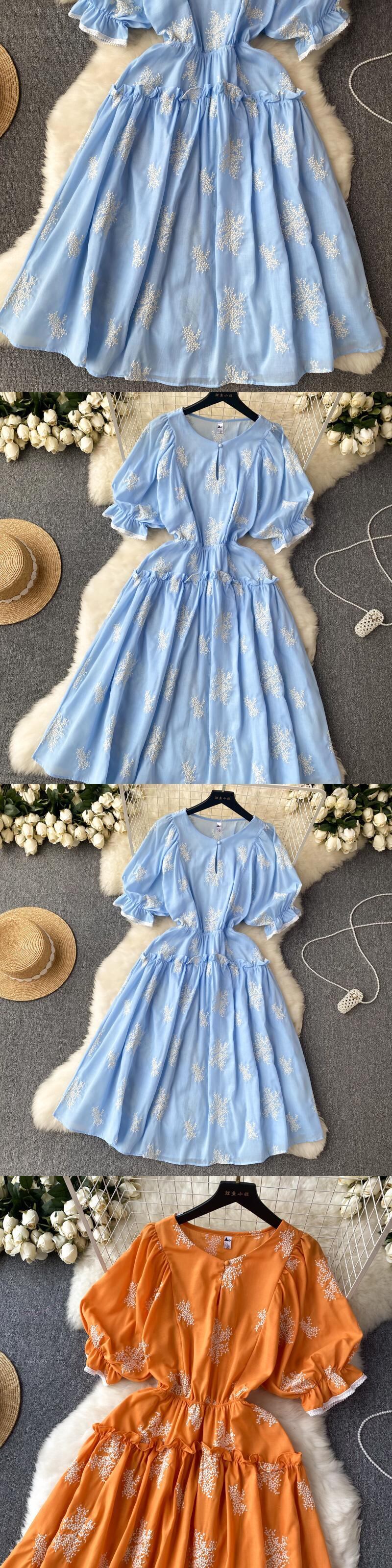 甘いストリートドレス O ネックショートパフスリーブ弾性シャーリング休暇シックプリントビーチ A ラインサンドレス エラスティック 伸縮 大人ガーリー スウィート キュート カジュアル Oネック Aライン