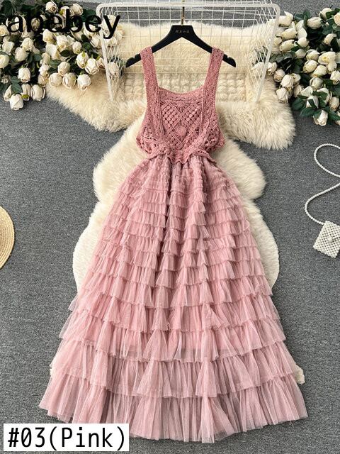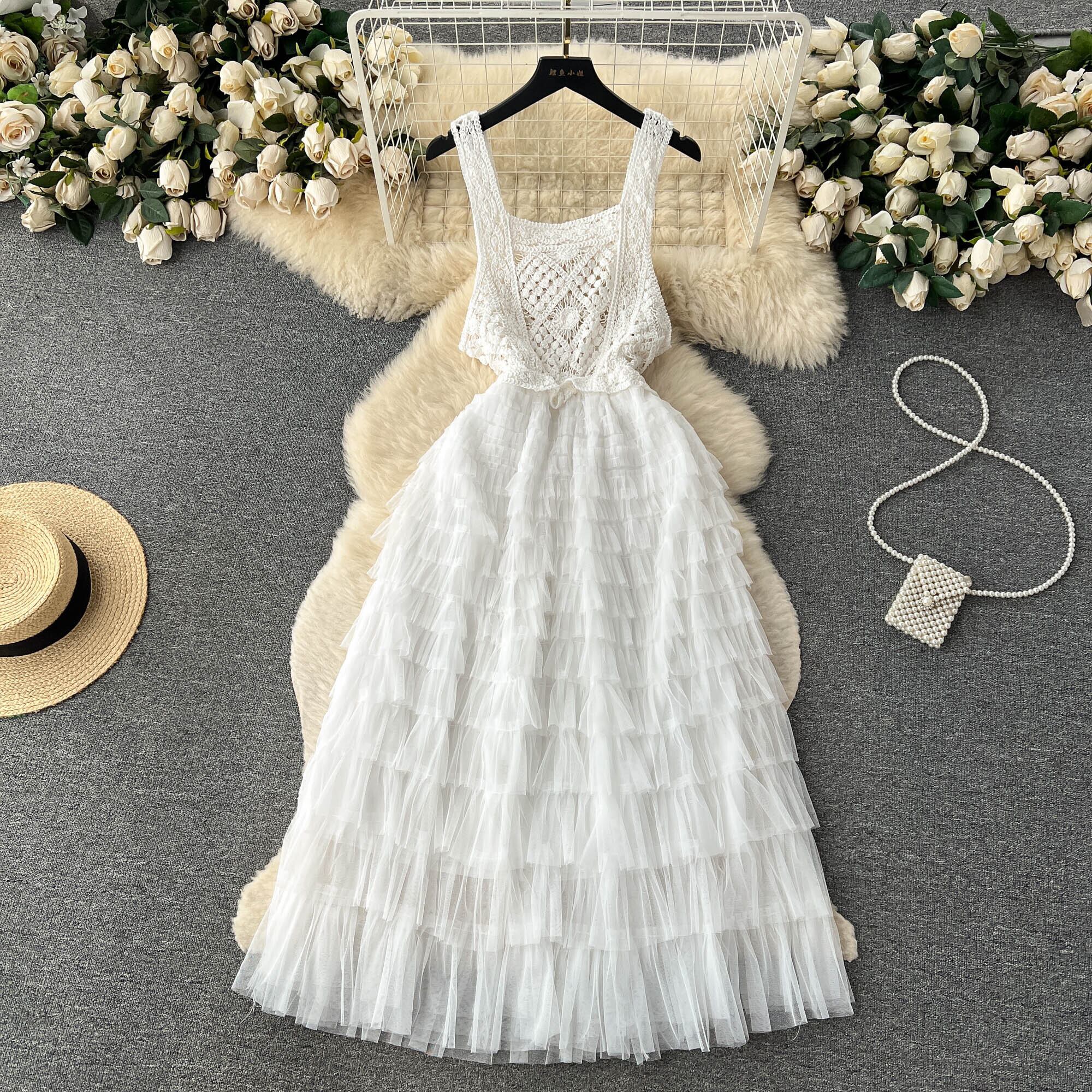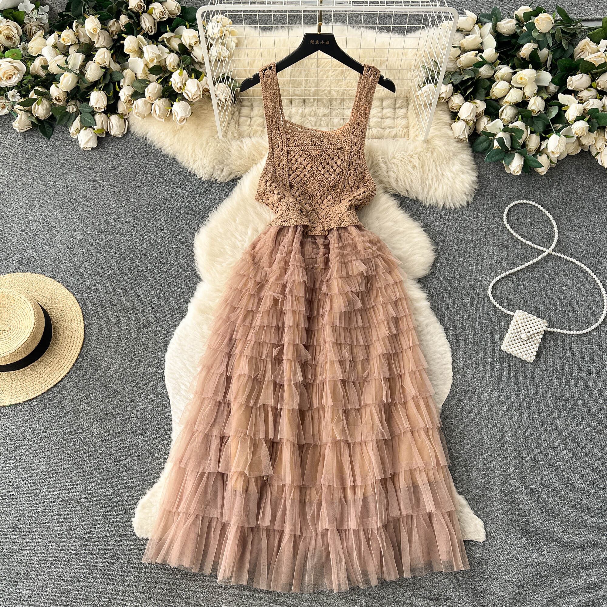サマーケーキドレス サスペンダー ニット パッチワーク メッシュ シーサイド バケーション ボヘミアン バックレス ロングドレス 夏物