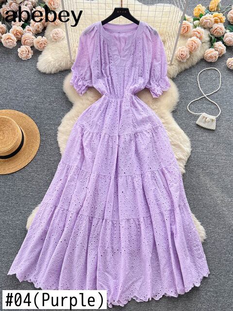 パープル/グリーン/レッドレースマキシドレス甘い V ネックフリル Vestidos ウエストスリムローブ春夏 大人ガーリー スウィート キュート カジュアル スプリング 春物 サマー 夏物 Vネック