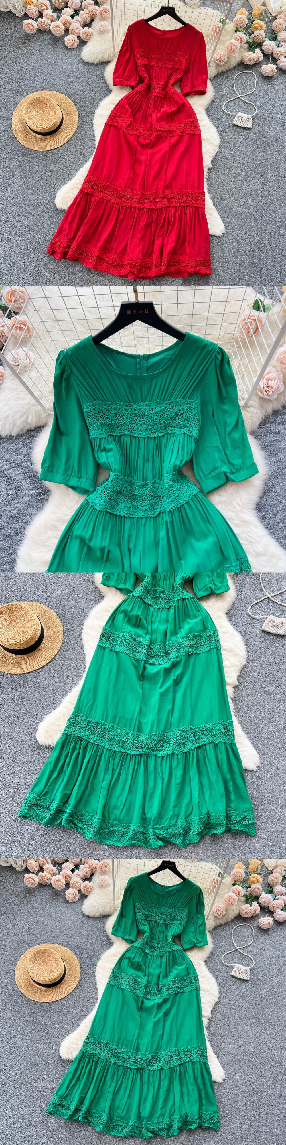 夏刺繍プリーツシフォンロングドレス O ネックパフ半袖ウエストドレープマキシ Vestidos ショート ハーフスリーブ サマー 夏物 Oネック