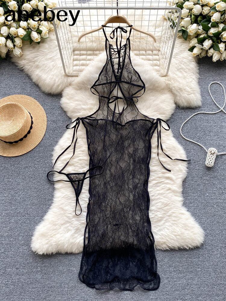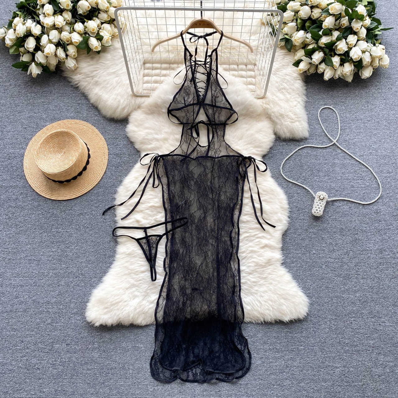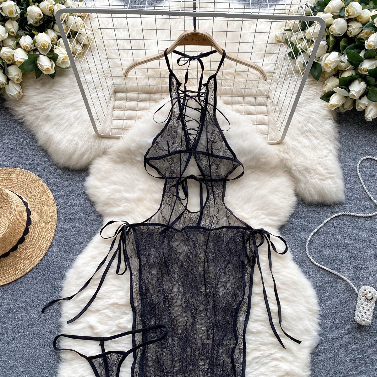中空アウト薄手パジャマスリムチャイナエロランジェリー分割ナイトウェアセクシー背中開いたホルターロングナイトドレス