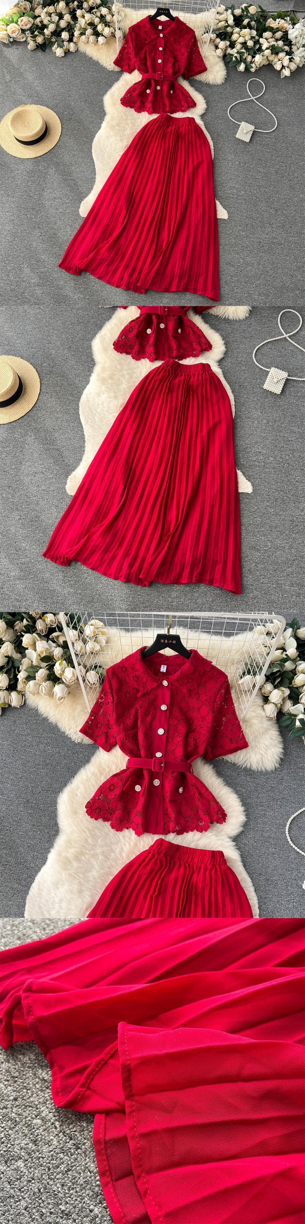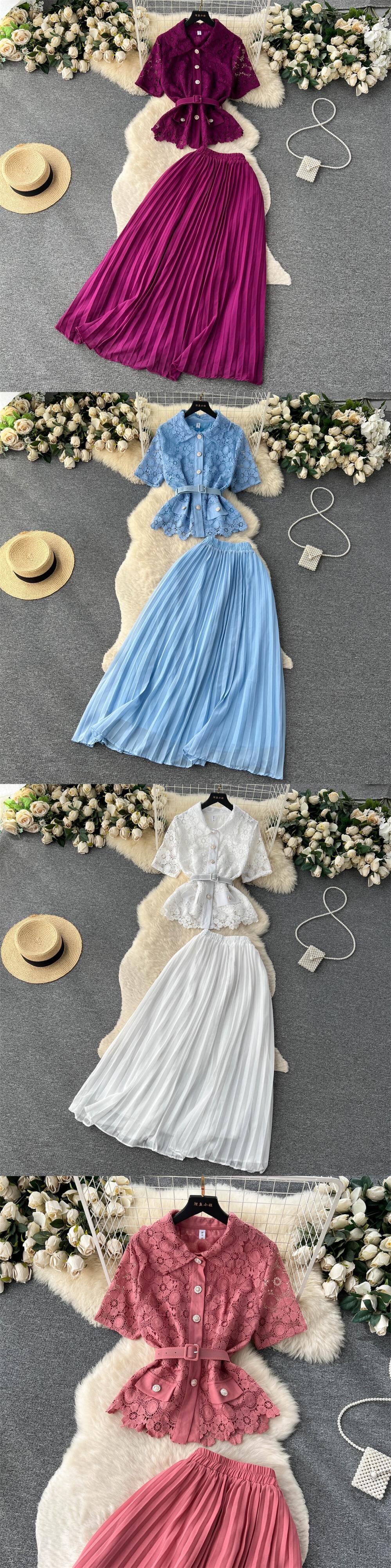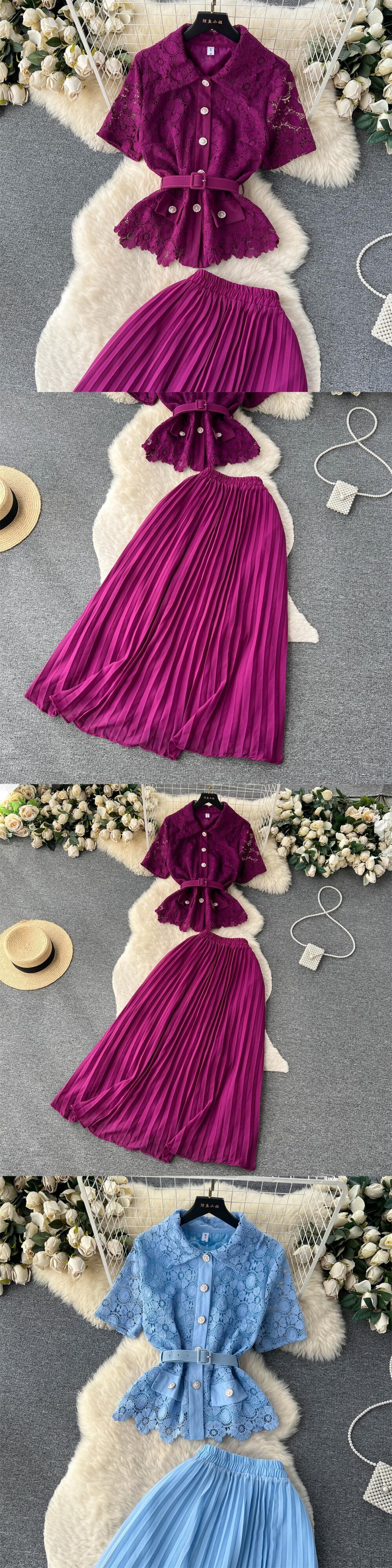夏レースパッチワークツーピースセットピンク半袖トップス + ウエストプリーツミディスカートスーツ ショート ハーフスリーブ サマー 夏物