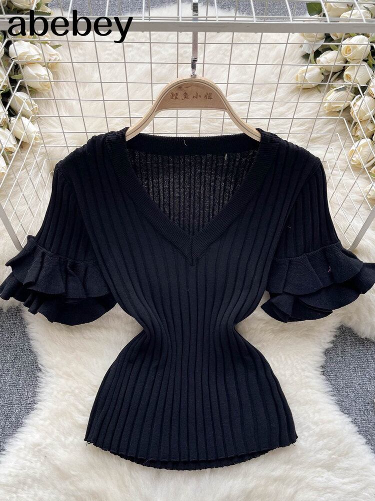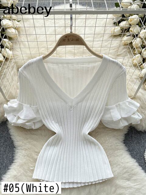 夏フリルニットブラウス V ネック半袖スリム弾性ウエストトップ ショート ハーフスリーブ ラッフル エラスティック 伸縮 サマー 夏物 Vネック