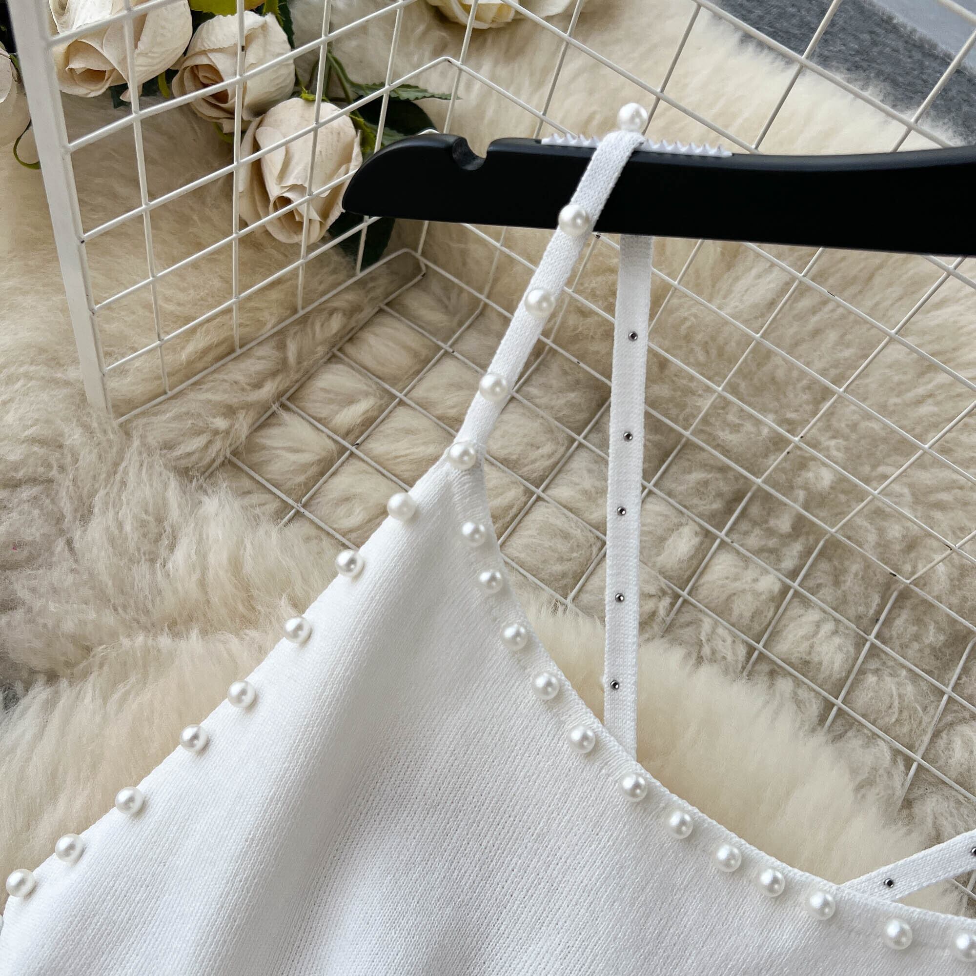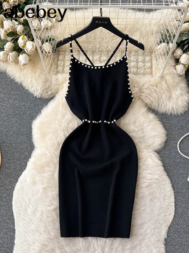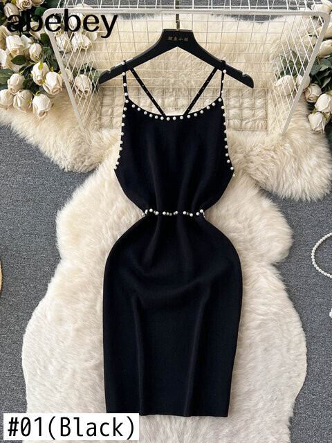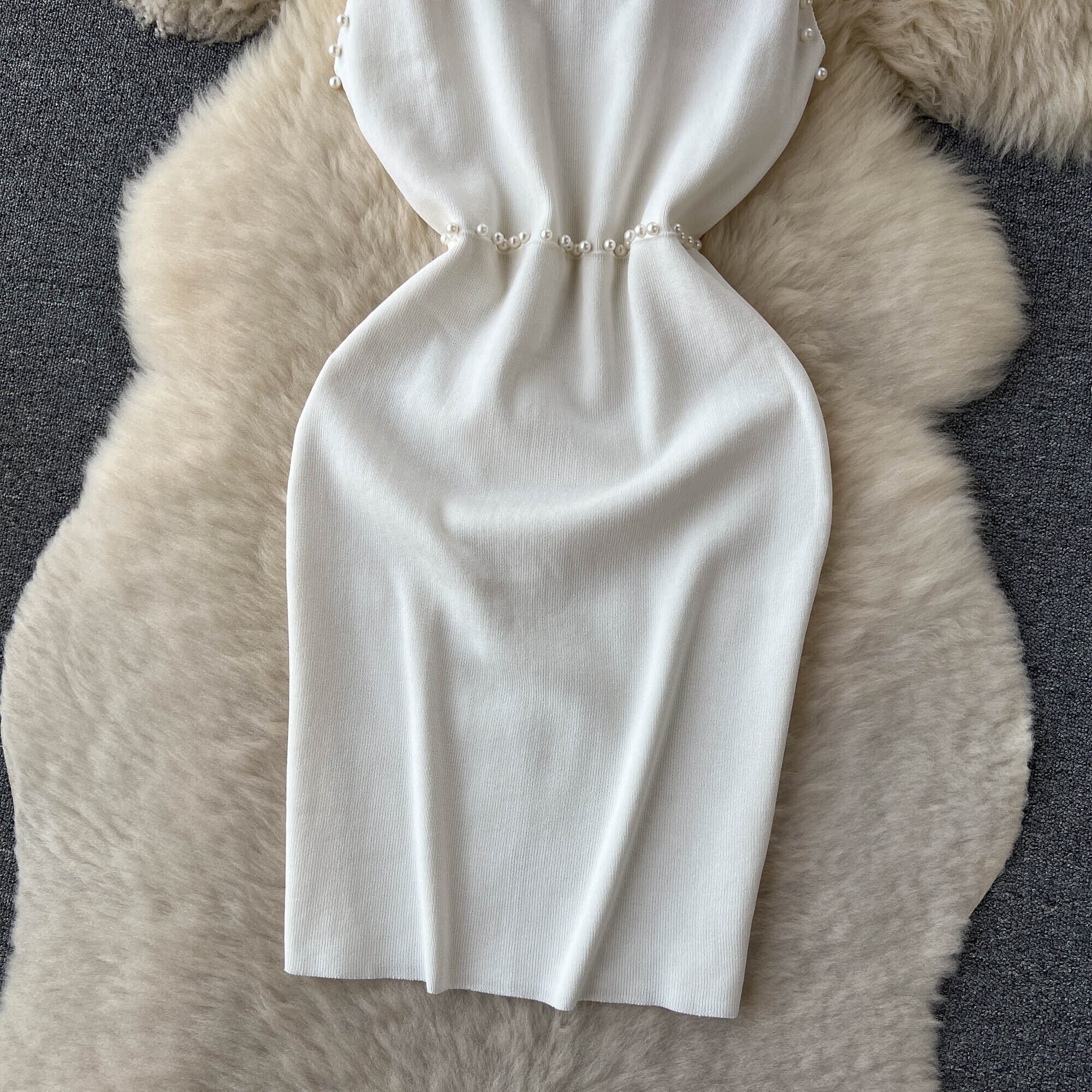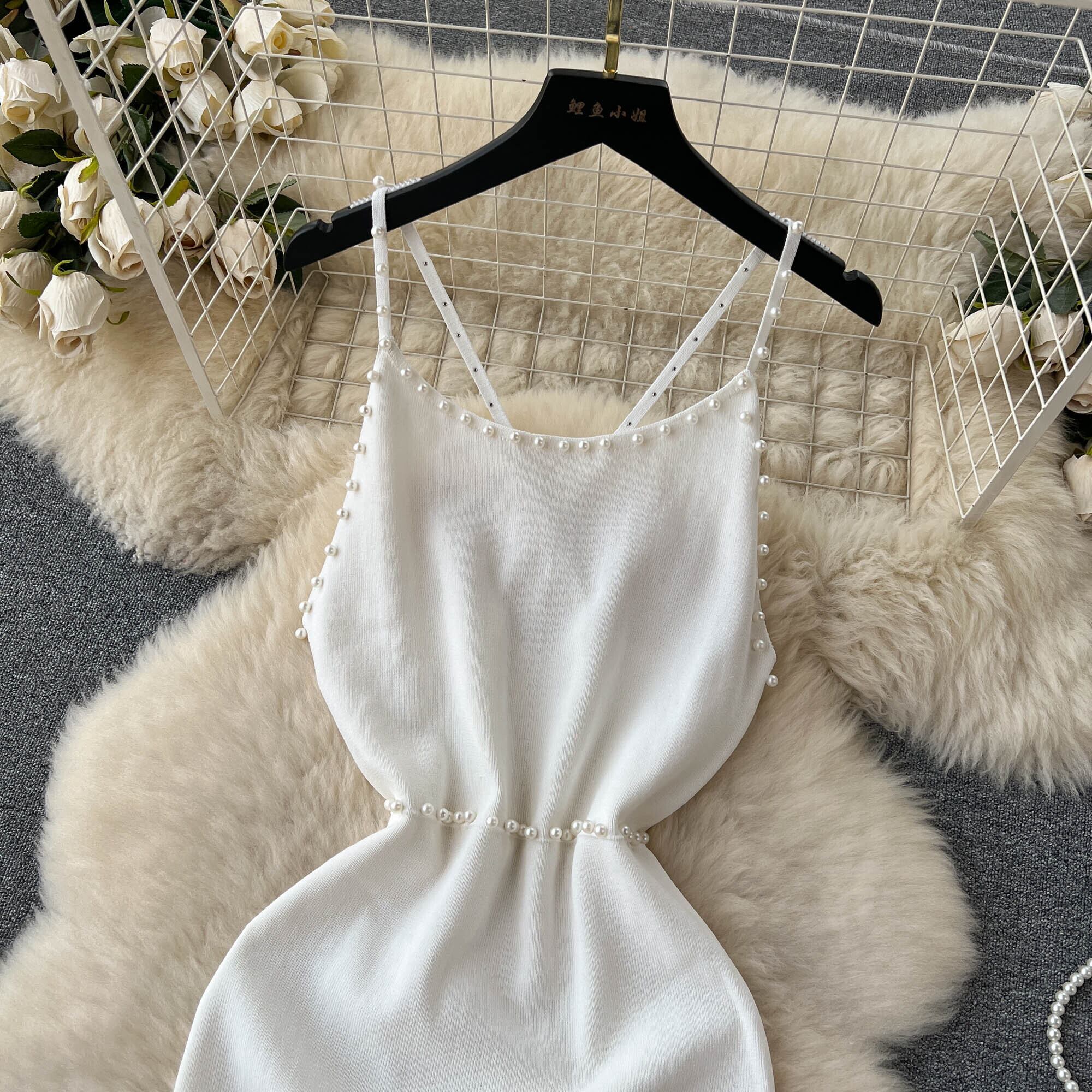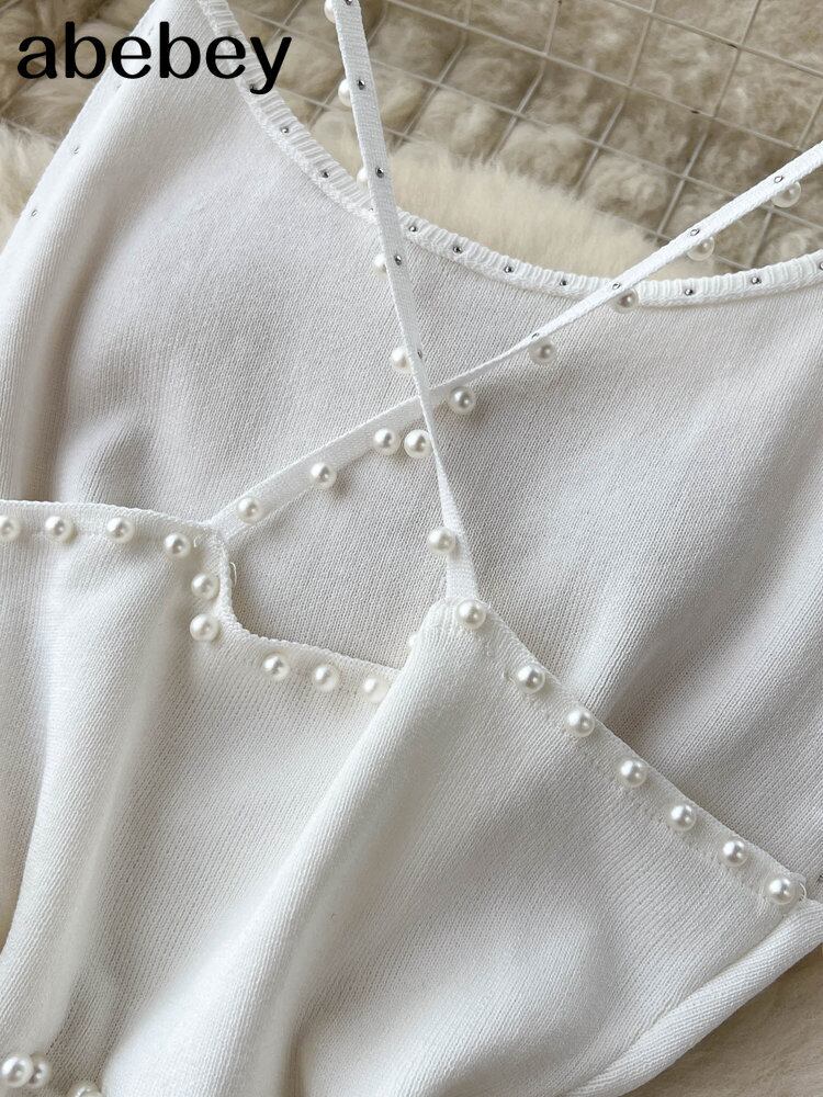 ビーズホワイトサマーニットセクシーストラップドレスタンク弾性ウエストボディコンサンドレスビーチ背中開いたショートミニドレス 夏物