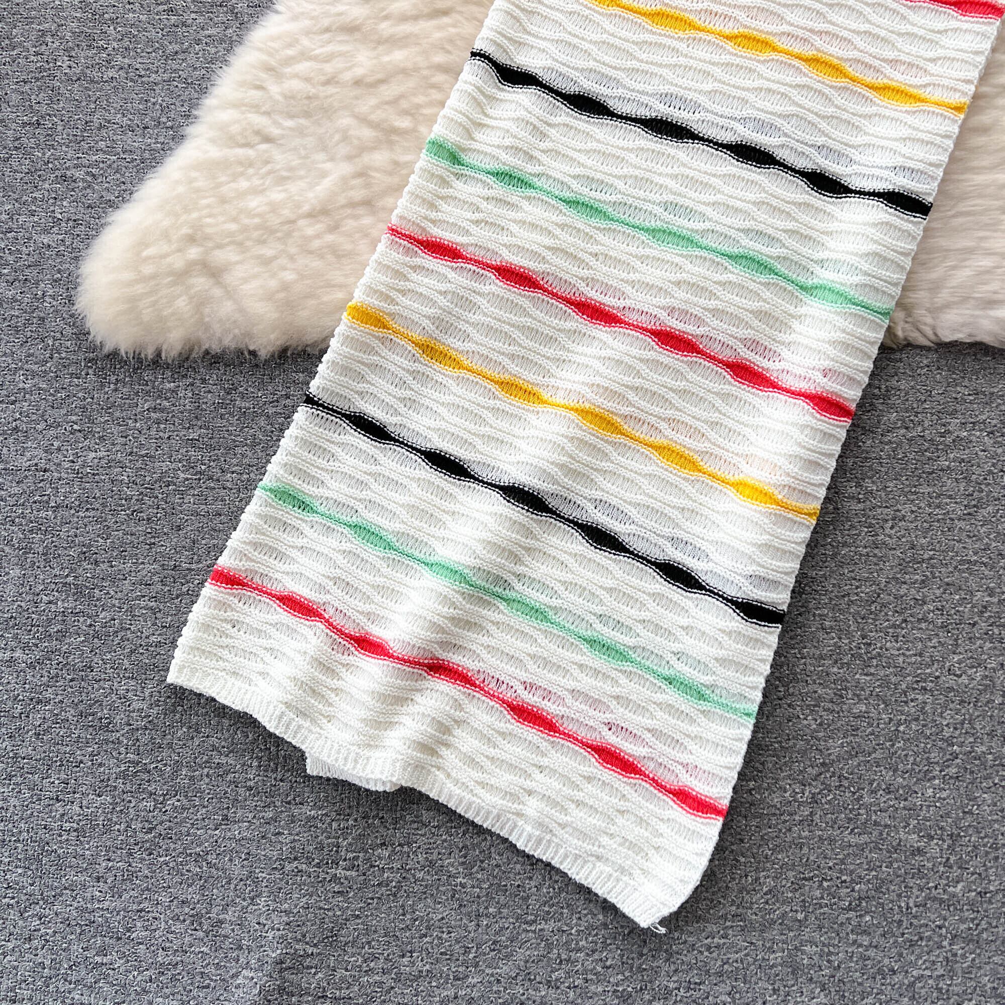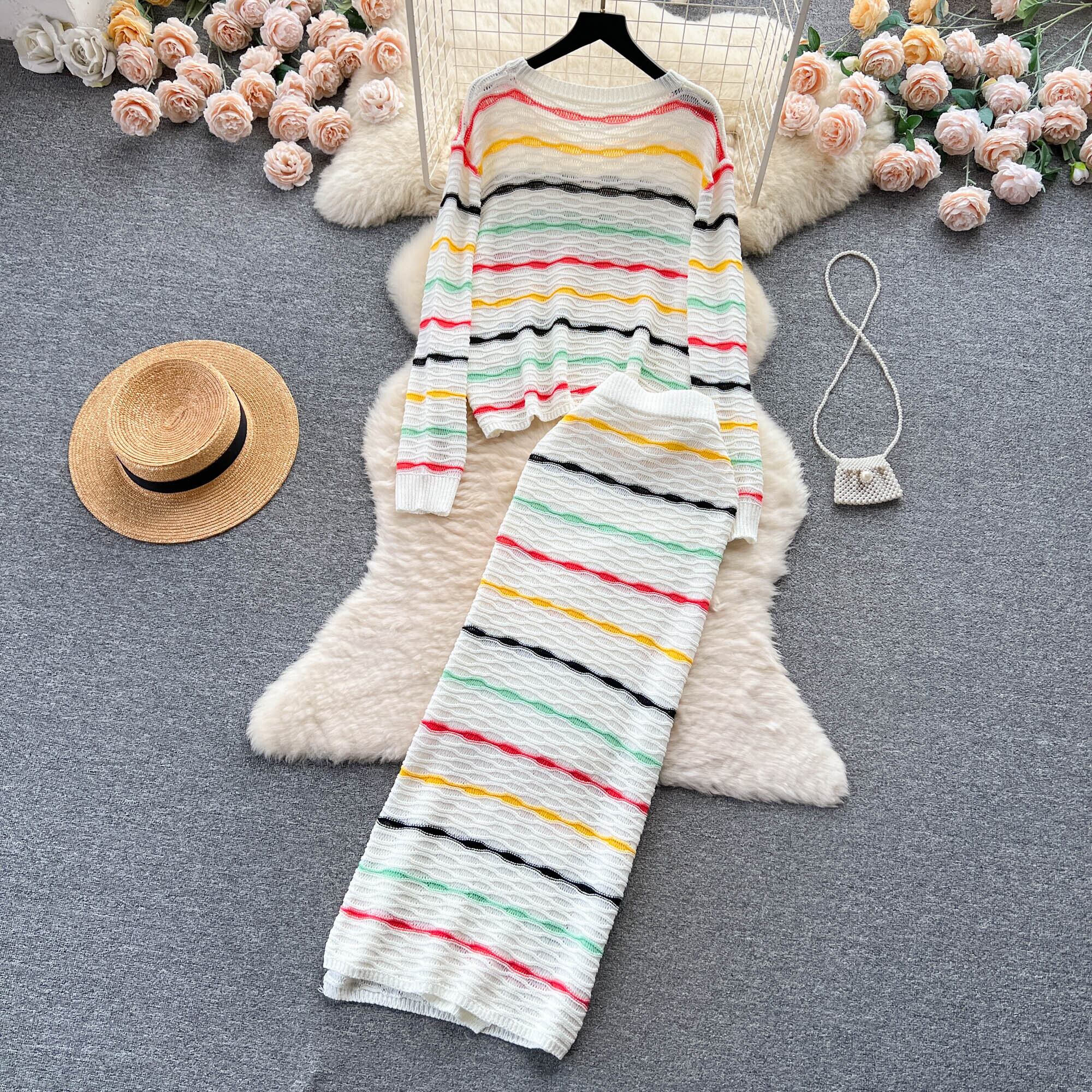 夏ニット 2 枚スーツルーズ長袖トップ + 弾性ロングスカートフランス人休暇ストライプボヘミアンビーチセット エラスティック 伸縮 サマー 夏物