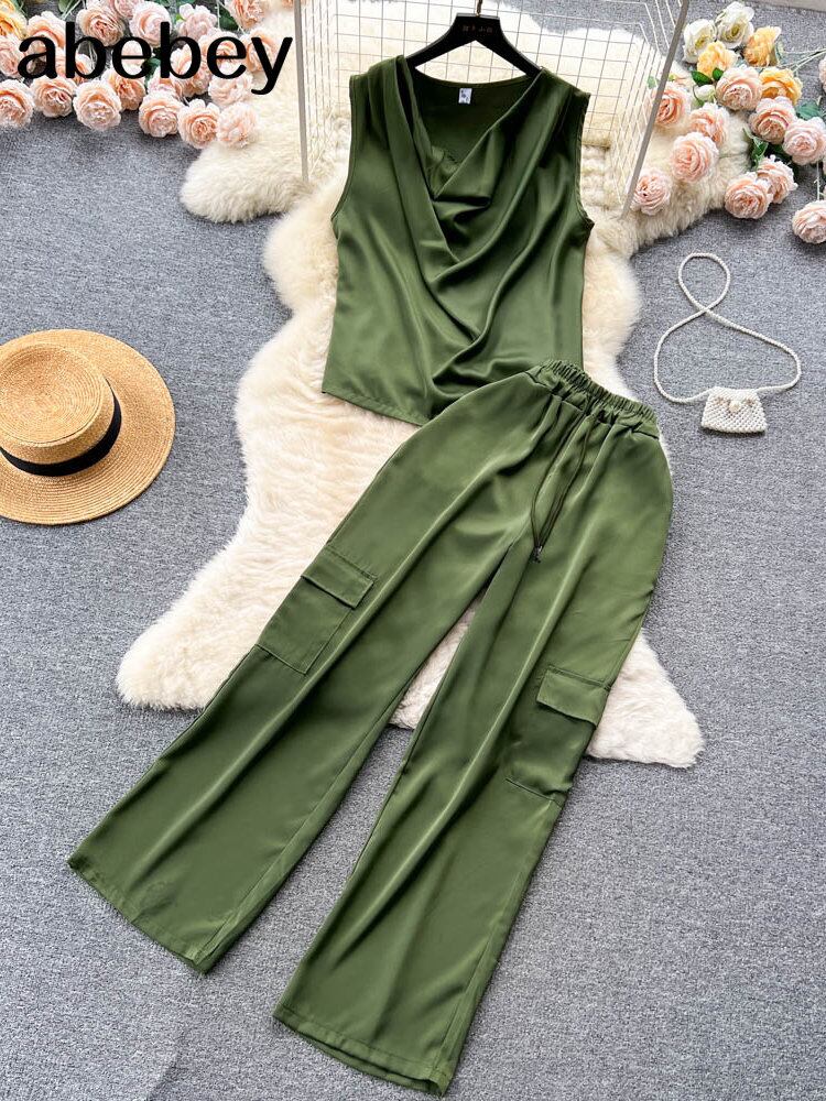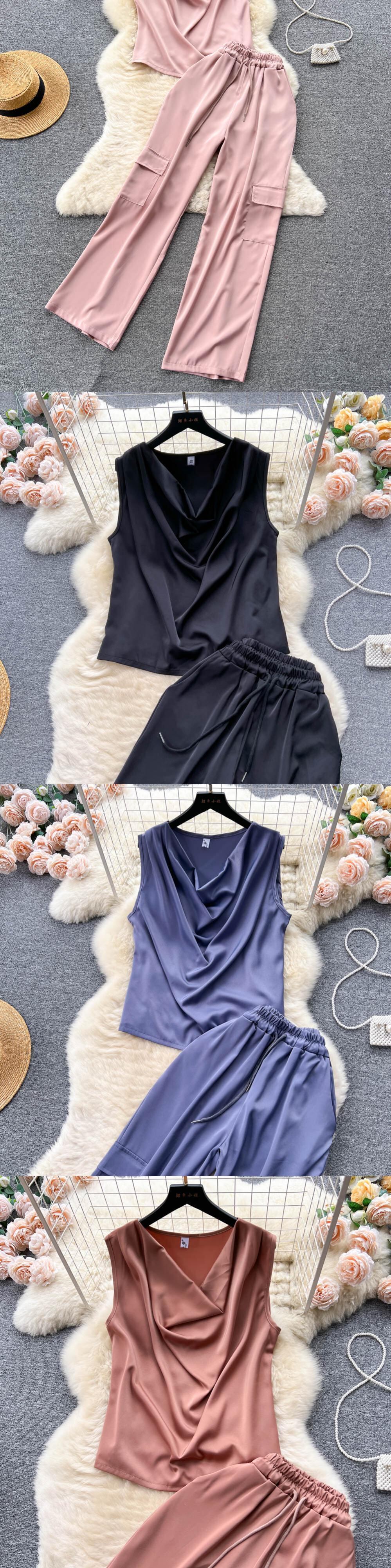 休暇ビーチスーツスリムノースリーブタンクトップ + 弾性ワイドレッグパンツ夏ストリート 2 個セット エラスティック 伸縮 サマー 夏物 ワイドパンツ ソリッドカラー