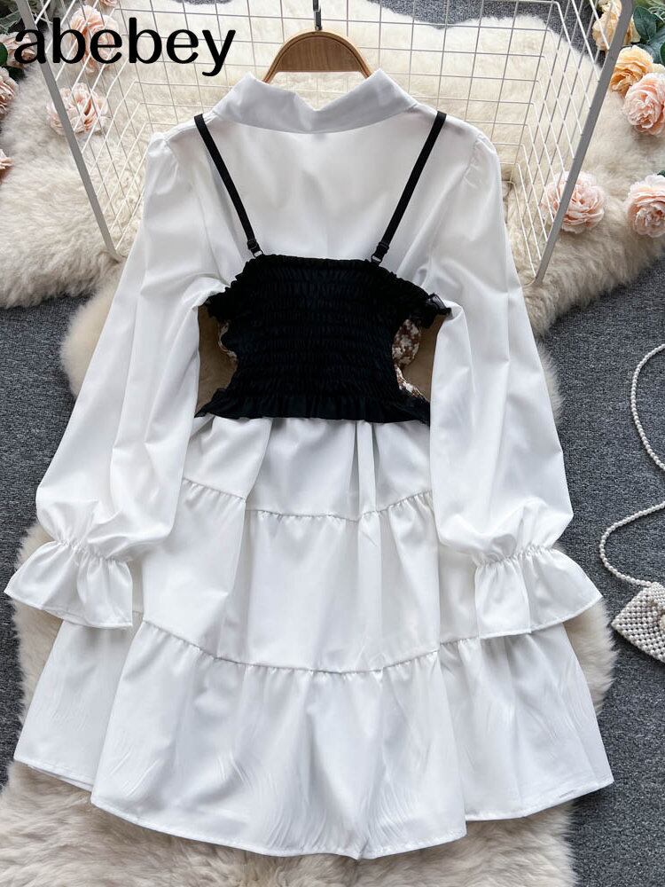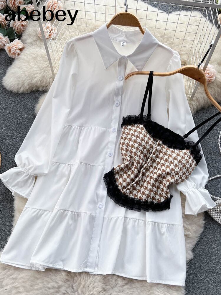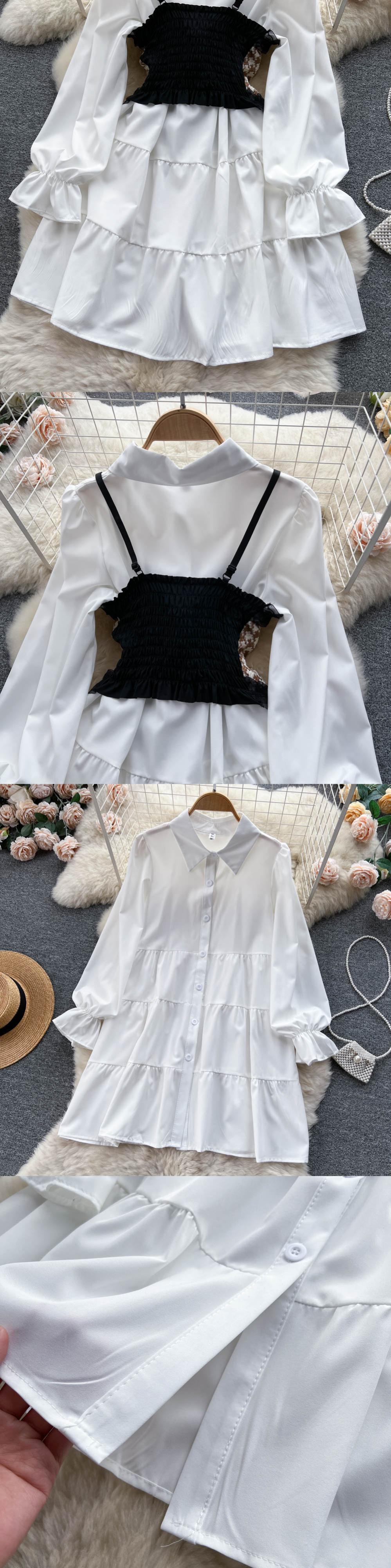フリル Hotsweet シャツドレス長袖チェック柄キャミソール + ホワイトミディドレス 2 Piceces スーツ ロング ラッフル 大人ガーリー スウィート キュート カジュアル