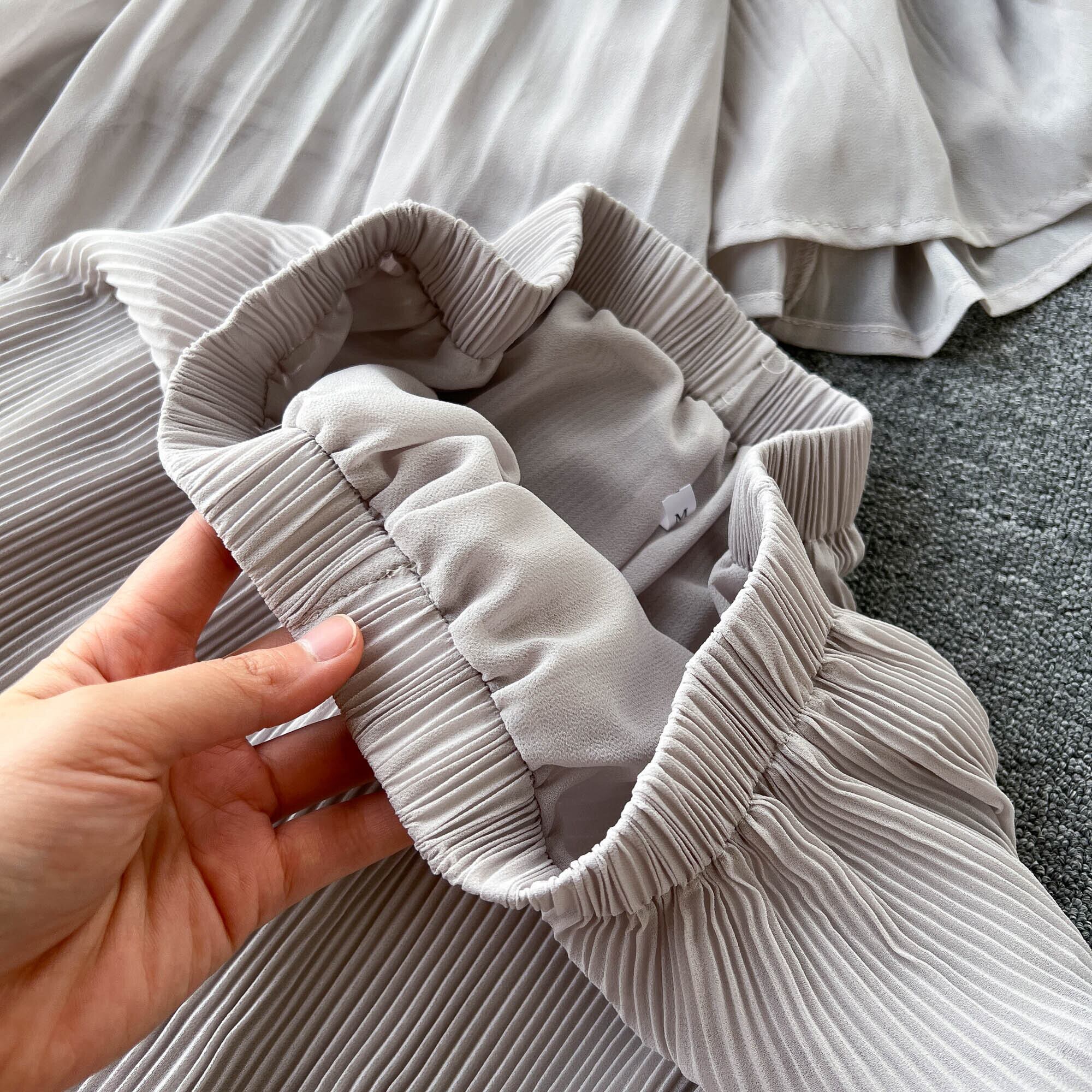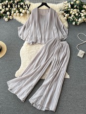 シャツ プリーツ 2 点セット グレー ルーズ ウエスト ワイドレッグ パンツ スーツ オフィス 服装 ワイドパンツ 会社 学校 通勤や通学にも