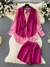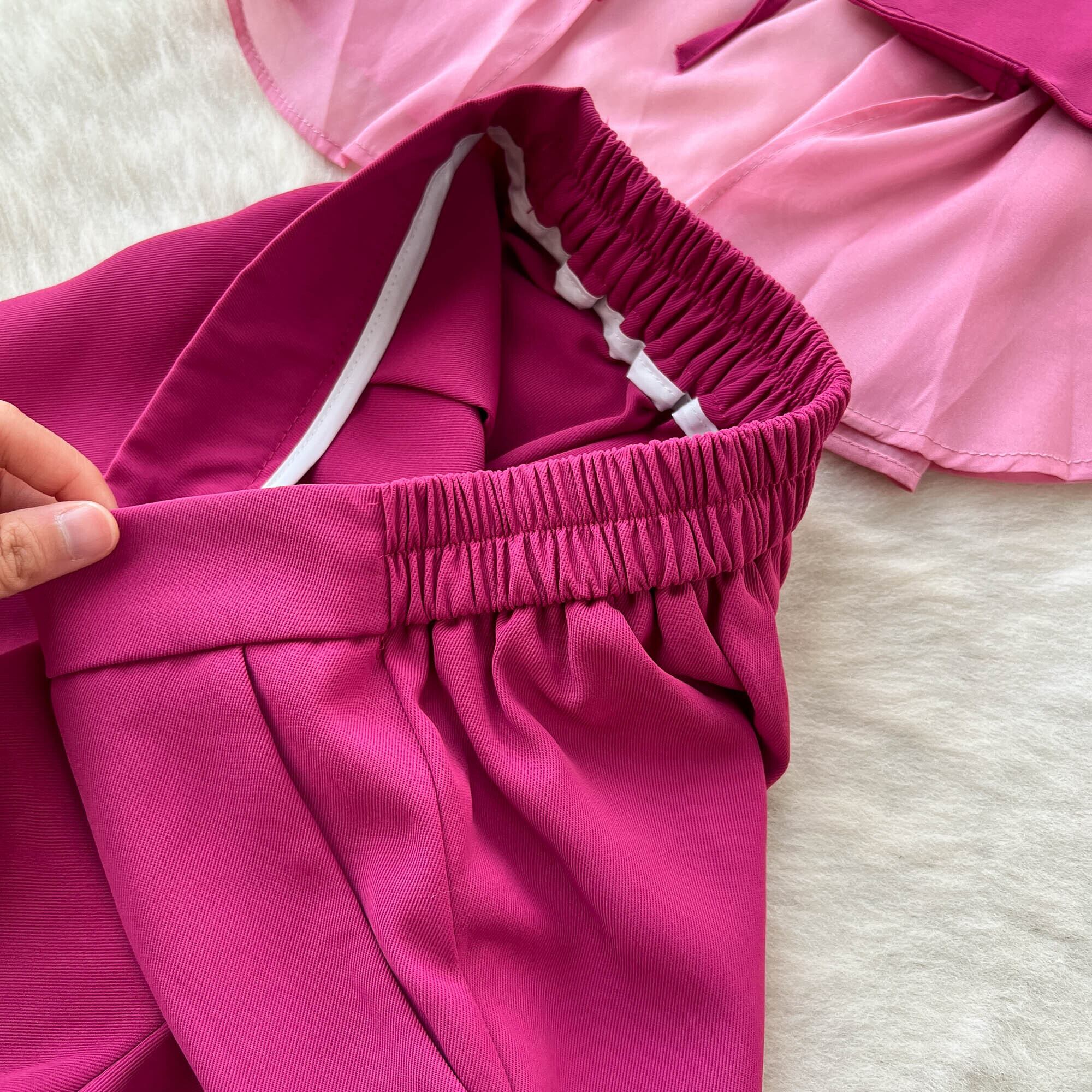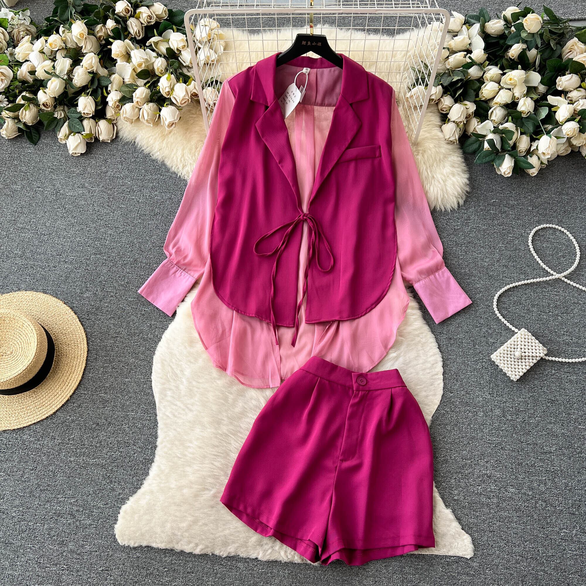 夏パッチワークレッドシフォン 2 枚セット長袖ローズレッドセットシャツショーツセット衣装 ロング サマー 夏物 ブルマー