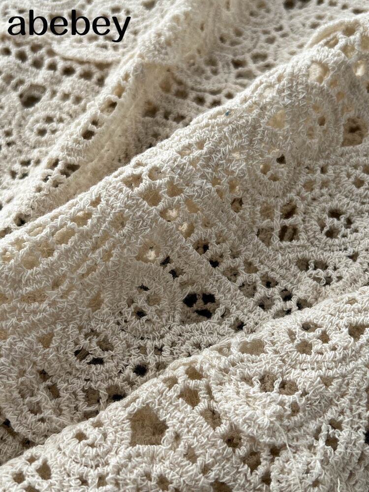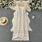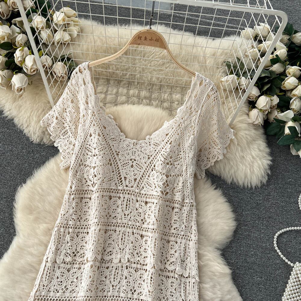 V ネックかぎ針編みドレスニットカットアウトドレス Jurk Dames ビーチドレス半袖 Vestidos マキシロングドレス ショート ハーフスリーブ