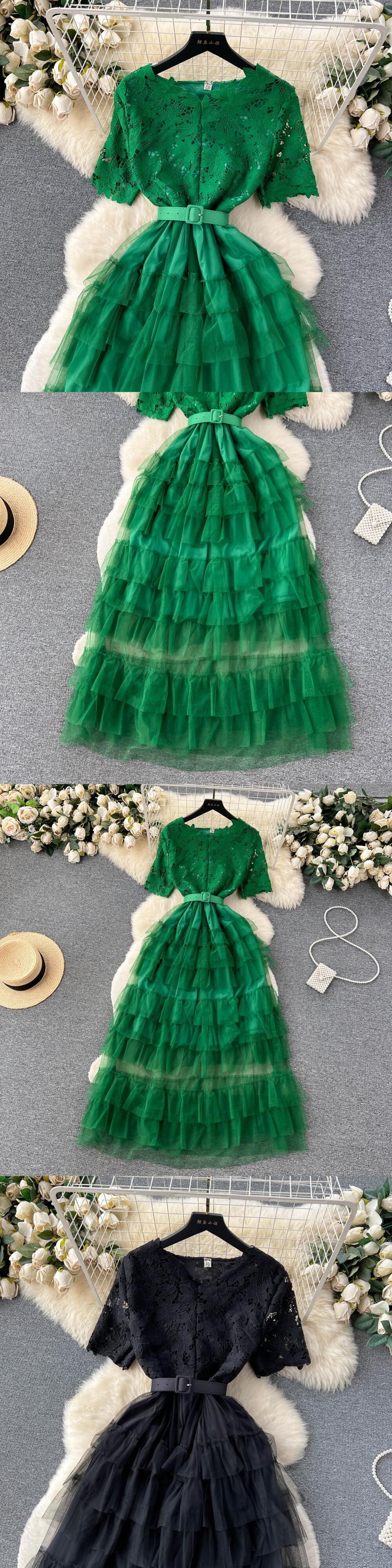フレンチレーススプライスメッシュドレス弾性ウエストベルトジッパースリムフックフラワー中空ロングドレス エラスティック 伸縮 ハーネス フラワーデザイン