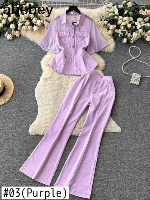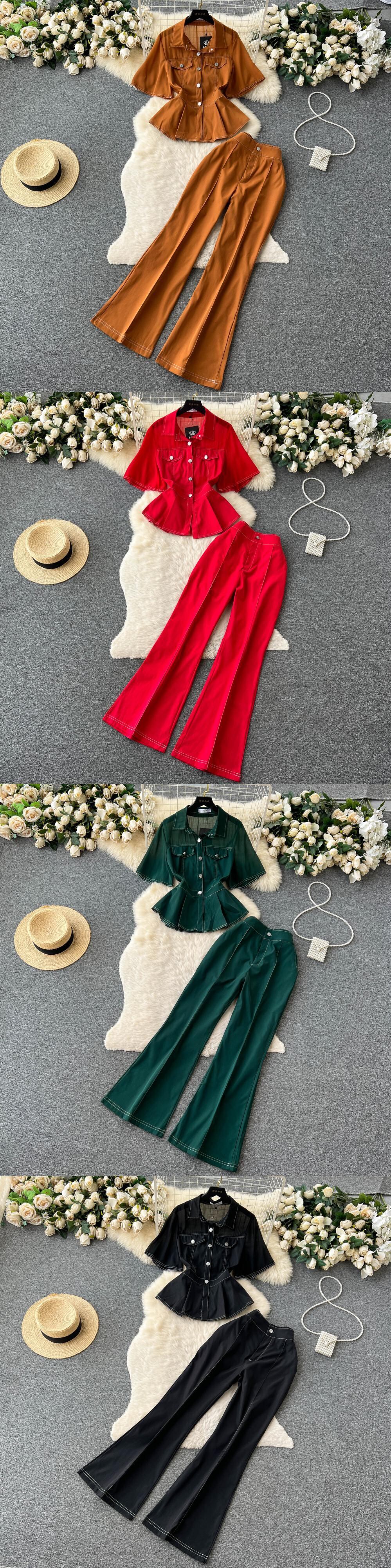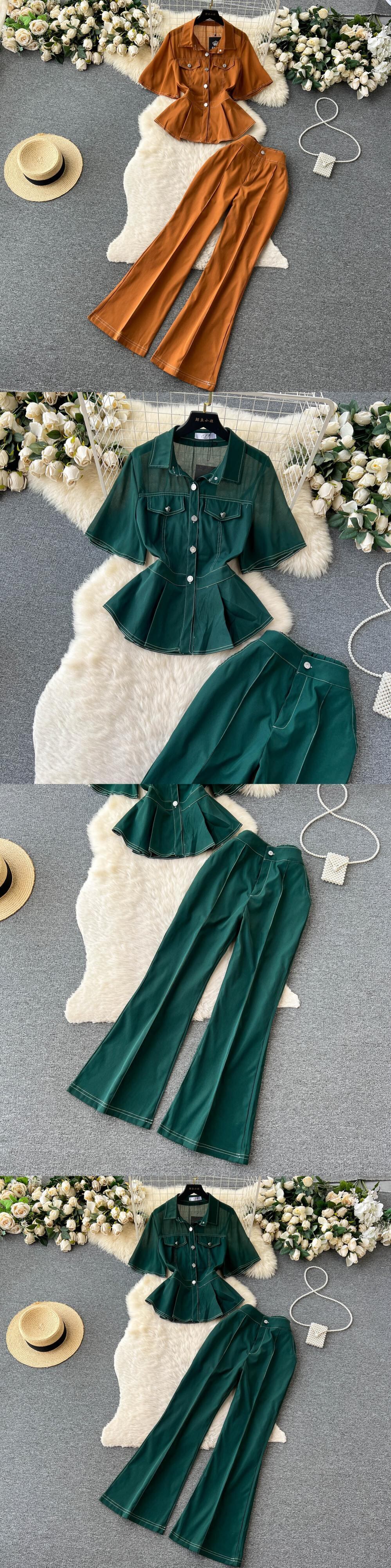 ツーピースセットレディースターンダウンカラートップスとワイドレッグパンツスーツ2点セット